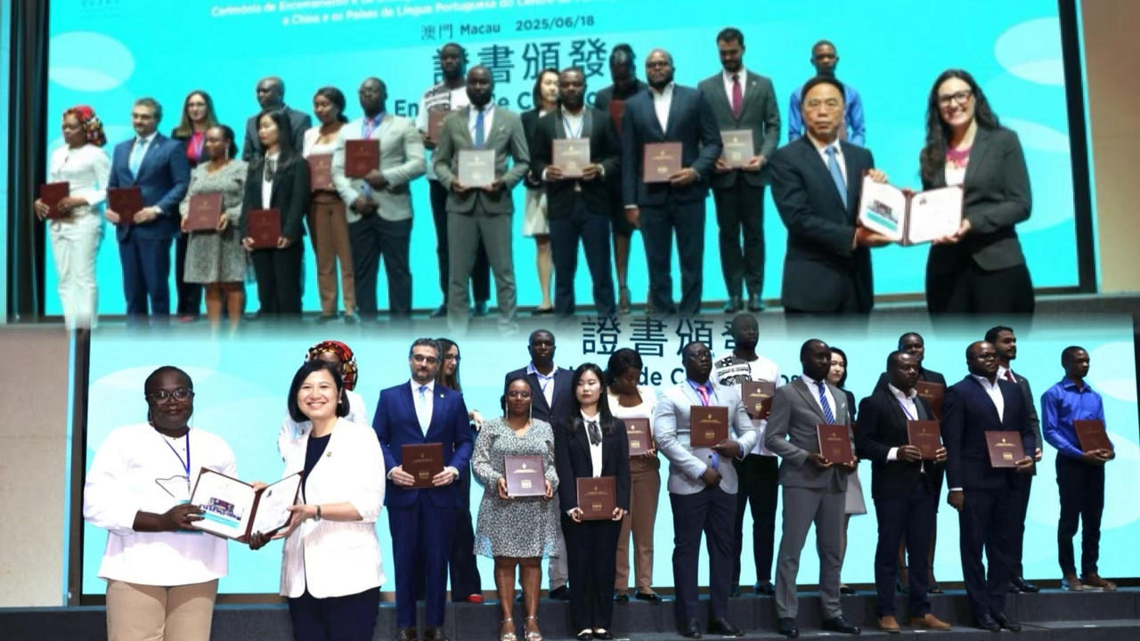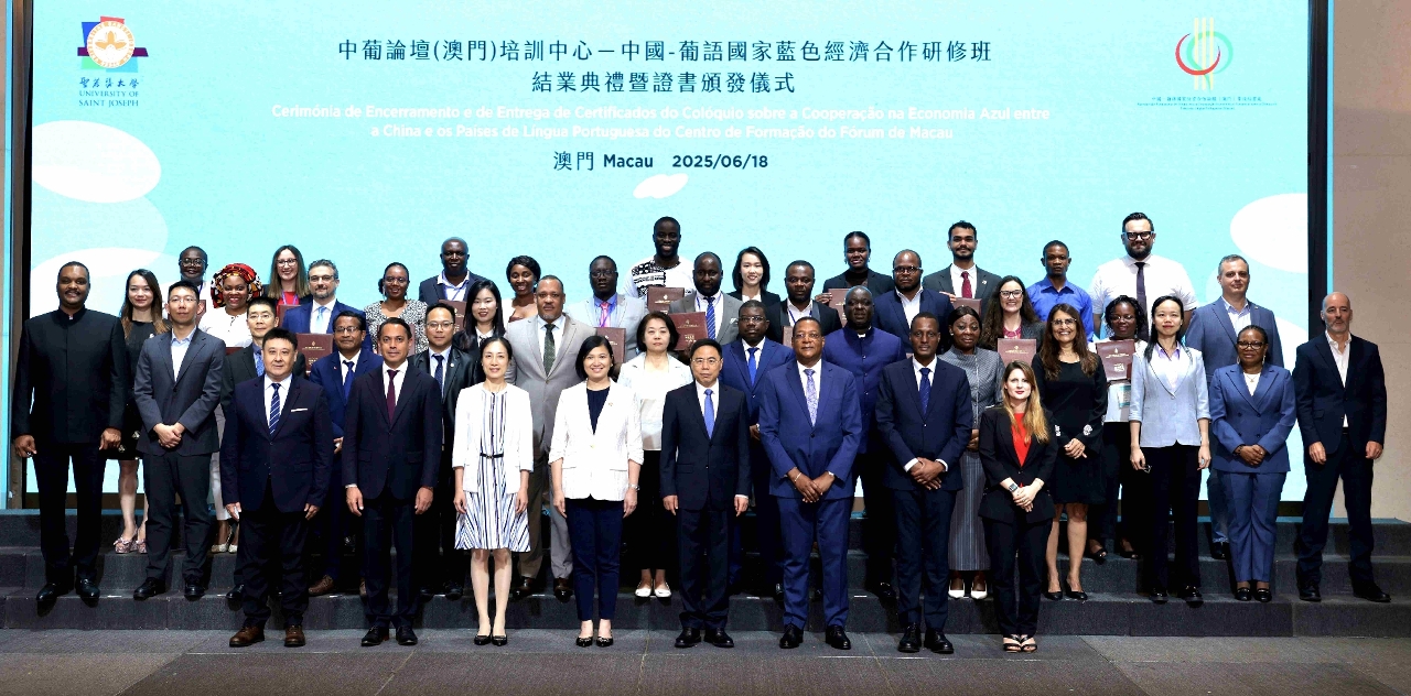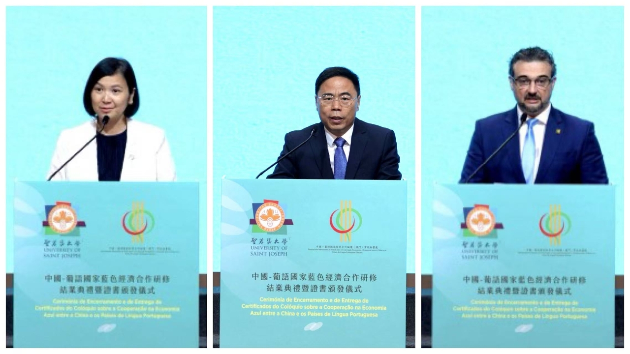 由中國—葡語國家經貿合作論壇(澳門)常設秘書處主辦、聖若瑟大學承辦的“中國—葡語國家藍色經濟合作研修班”6月18日在澳門旅遊塔舉行結業典禮暨證書頒發儀式。中葡論壇(澳門)常設秘書處秘書長季先峥、聖若瑟大學副校長農韻淇、研修班輪值班長卡洛斯‧儒尼奥爾等出席典禮並致辭。