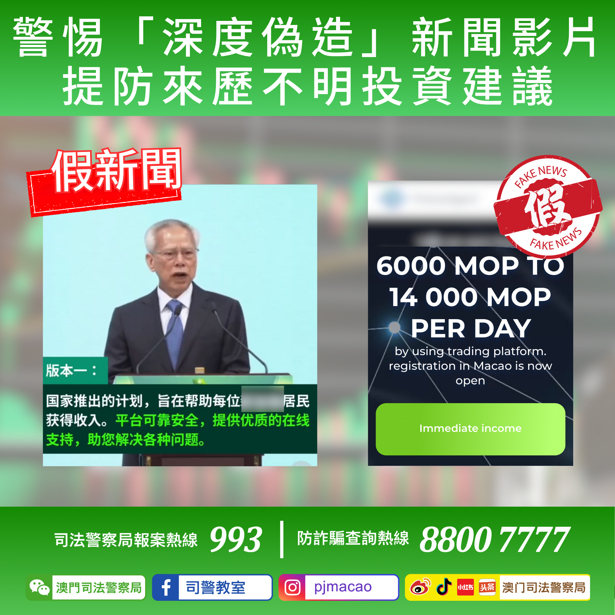 上述投資詐騙手法近年已陸續在不同國家及地區肆虐,騙徒藉由偽造當地官員或名人受訪影片推介高回報投資計劃,並以小額獲利吸引事主加大投入金額,最終造成事主巨額財產損失。而本澳繼早前出現首宗涉及AI偽造影片的騙案後至今再度出現同類型騙局,顯示騙徒正不斷嘗試假冒本澳不同知名人士伺機行騙。