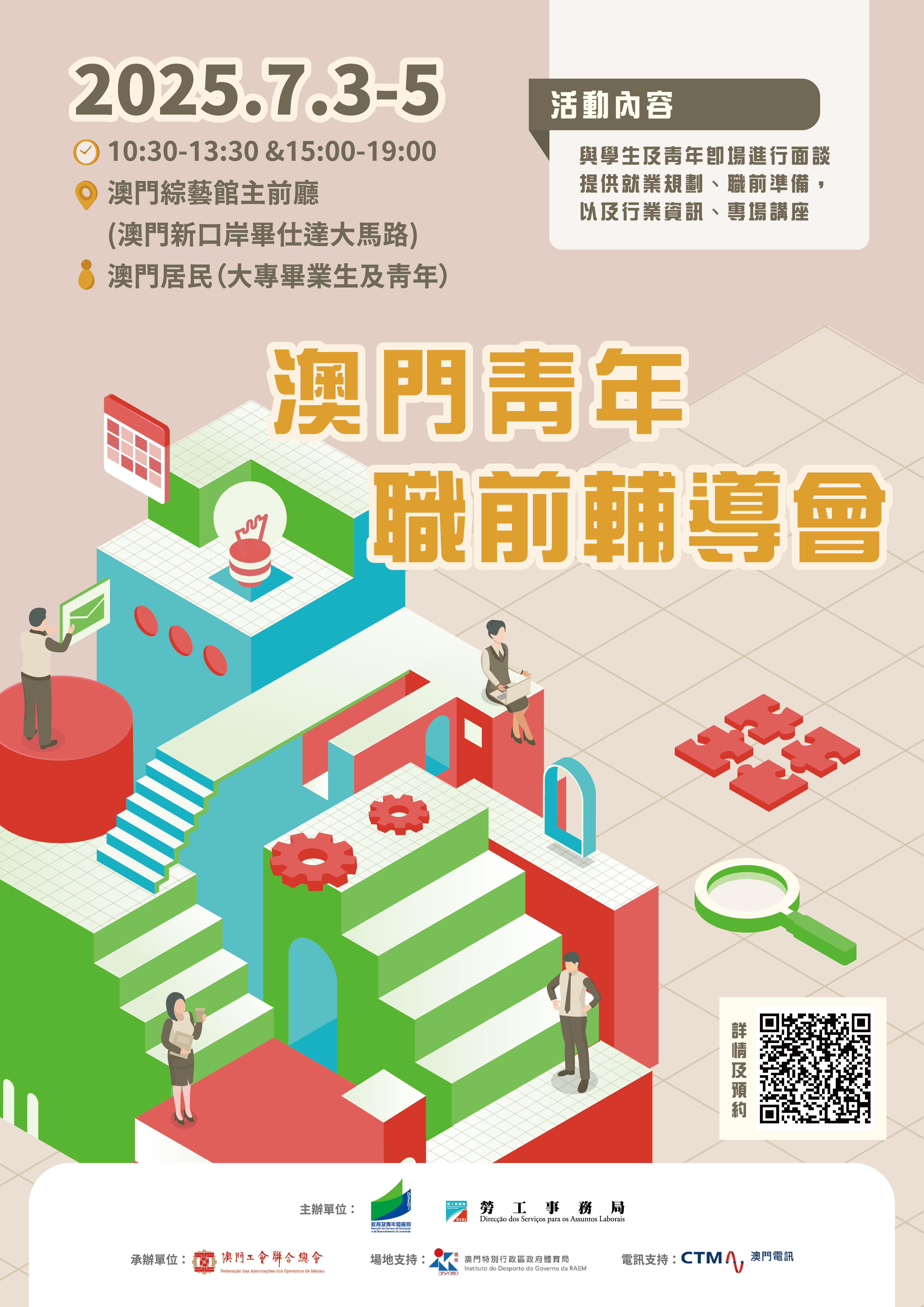 特區政府成立“促進就業協調工作組”,透過跨部門協作,全面協助本地居民優先就業。由教育及青年發展局(下稱教青局)和勞工事務局(下稱勞工局)主辦,並由澳門工會聯合總會承辦的“澳門青年就業配對會”(下稱配對會)於7月3日至5日一連三日在澳門綜藝館舉行,為本澳企業與求職青年搭建選配平台。現場提供選配職位和即場面試,助力澳門青年尋找適合自身發展的職位,為協助大專學生及青年更好地了解不同行業的發展前景和人才需求,規劃職業路向,同場亦舉辦“澳門青年職前輔導會”(下稱職輔會)。配對會及職輔會兩項活動由即日起可於網上預約及報名。