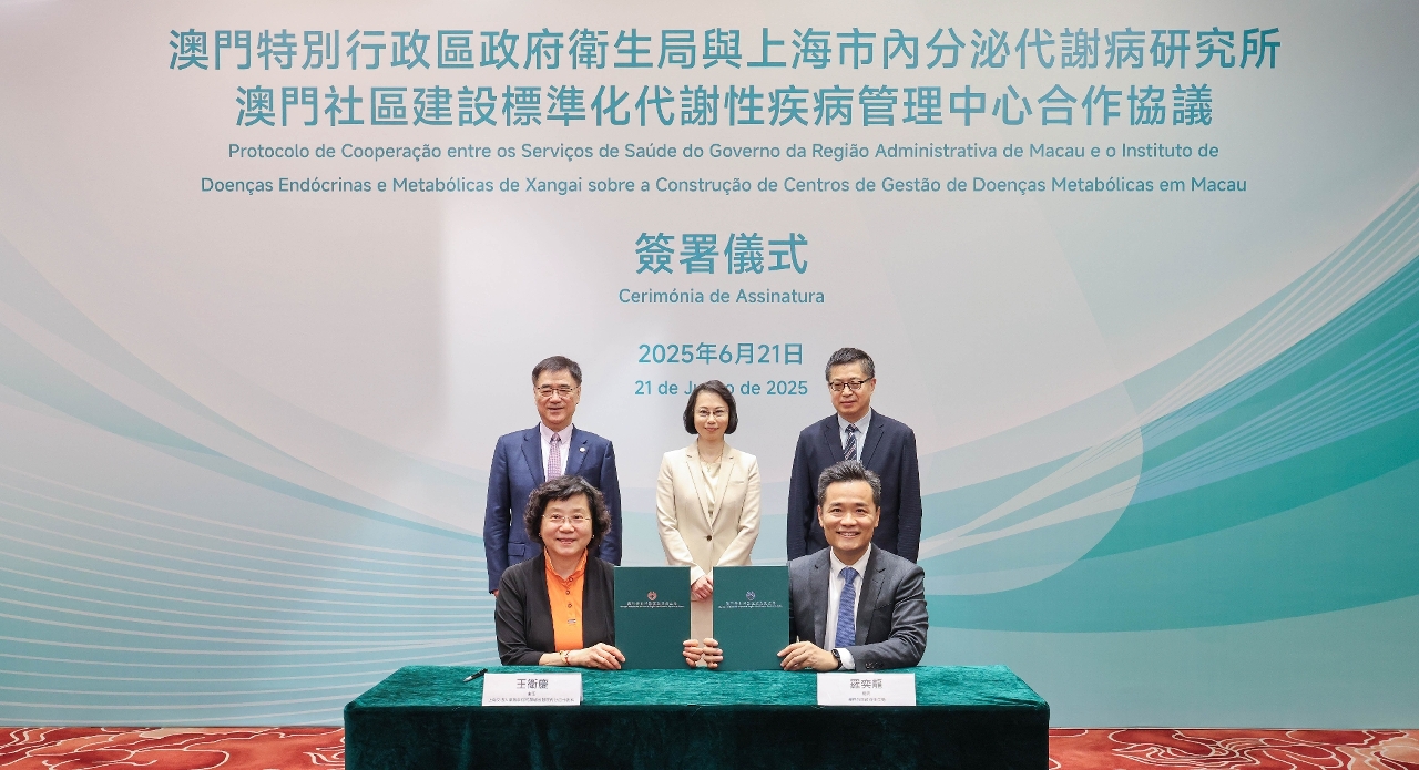 此外,在柯嵐司長、寧光院士和萬速成部長見證下,羅奕龍局長與上海交通大學醫學院附屬瑞金醫院內分泌代謝科主任王衛慶共同簽署了《澳門社區建設標準化代謝性疾病管理中心合作協議》,進一步促進澳門特別行政區慢性病管理的標準化,強化基層醫療服務能力及深化區域醫療合作。