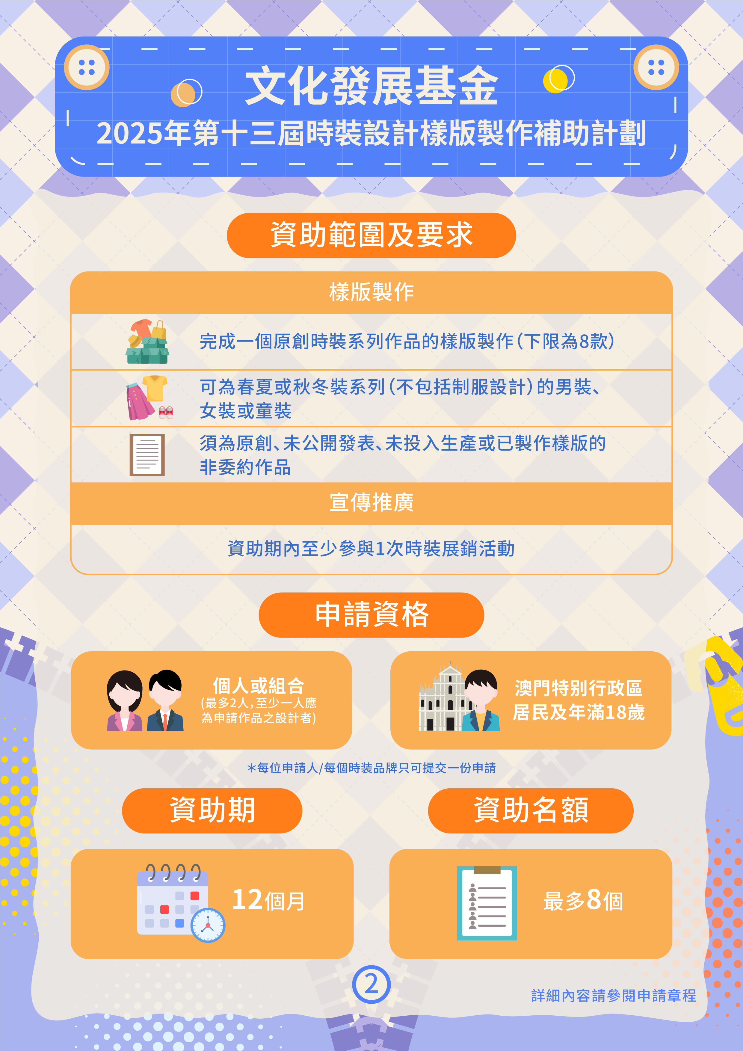 申請人須為年滿18歲的澳門特區居民,可個人或組合形式申請,作品須為未曾公開發表、生產或製作樣版的原創時裝系列,且款式數量不得少於8款,並須於資助期內至少參與1次時裝展銷活動。