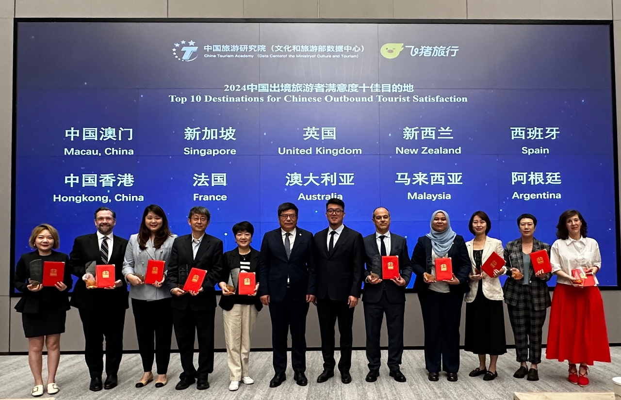按中國旅遊研究院公佈,“2024中國旅遊者出境滿意度十佳目的地”按次排序:中國澳門、新加坡、英國、新西蘭、西班牙、中國香港、法國、澳大利亞、馬來西亞及阿根廷。