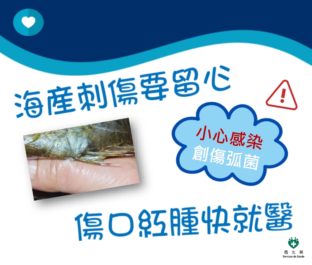 患者是75歲女性,本澳居民,有慢性病史。5月24日下午在家中處理魚時不慎被刺傷右手手指;25日凌晨出現發熱及刺傷部位腫痛,到仁伯爵綜合醫院就醫,診斷為右手手指壞死性筋膜,需入院進行傷口清創及抗生素藥物治療。經實驗室檢測傷口分泌物樣本證實為創傷弧菌感染,6月23日因右手手指壞死接受手術治療,現已康復出院,患者同住家人無相似病徵。