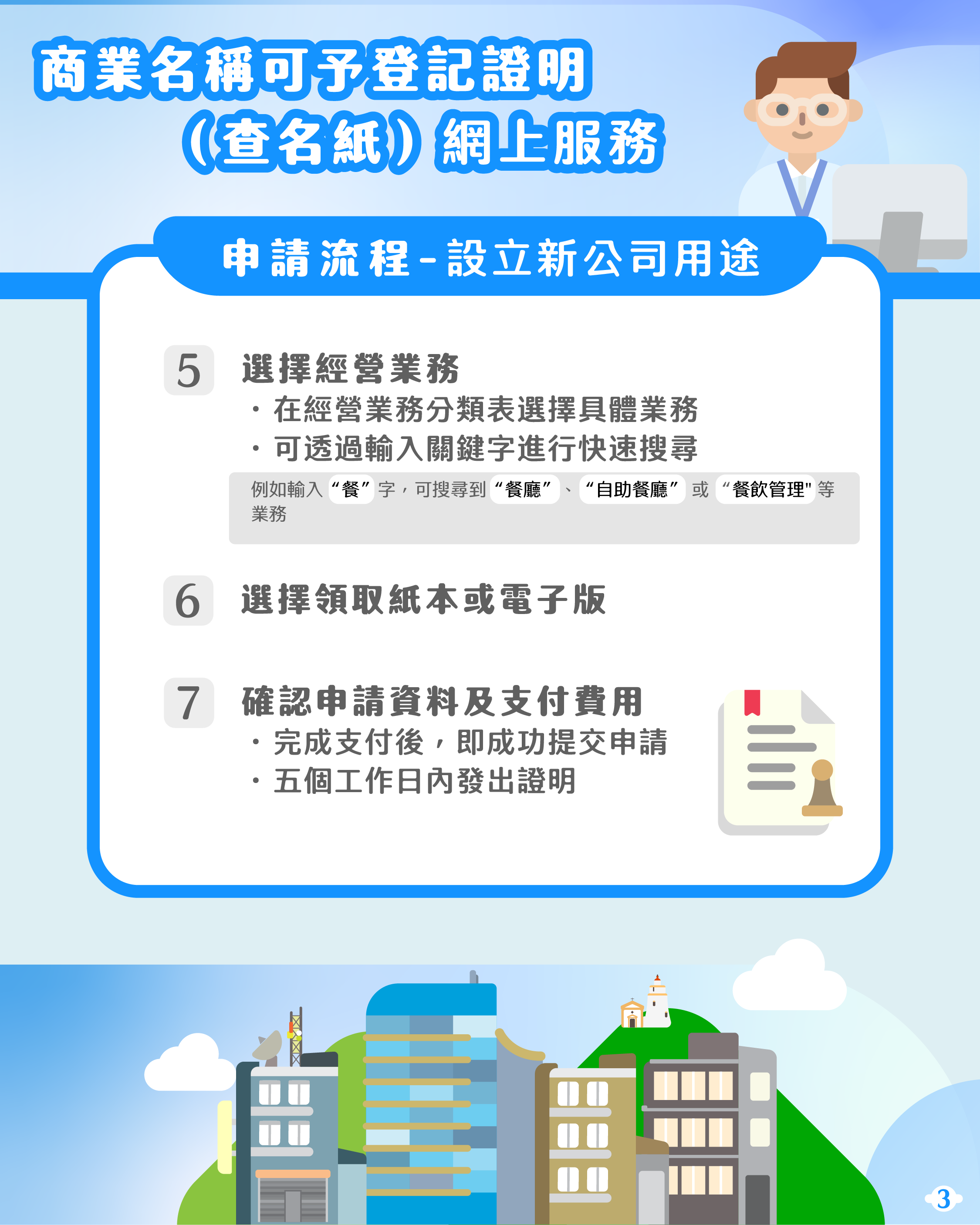 在商業名稱可予登記證明(即查名紙)方面,市民可透過“一戶通”或“商社通”申請查名紙,直接線上提取電子版查名紙或線下領取紙本版,免卻以往市民在設立公司、變更公司名稱或業務前,要親臨登記局申請及領取查名紙,以確認擬採用的商業名稱(公司名)可予以登記。