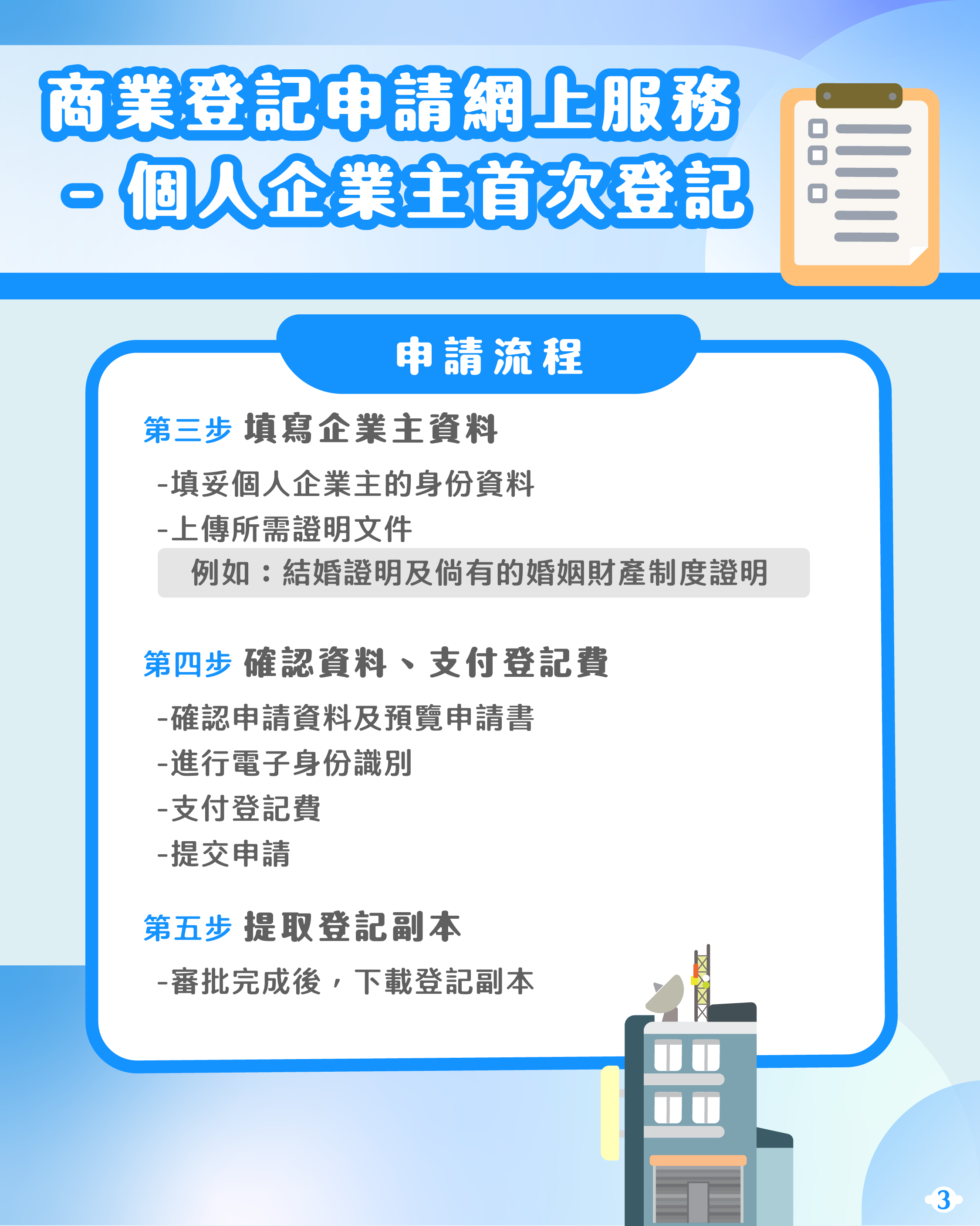在商業登記方面,新推出的自然人商業企業主首次登記、變更自然人商業企業主住所(地址)、註銷自然人商業企業主登記的全程電子化服務,均可透過“商社通”提交申請,實現指尖辦事新模式。申請人完成線上資料提交及繳付登記費,登記局即時接收有關申請,審批完成後,申請人即可在線上領取登記副本。