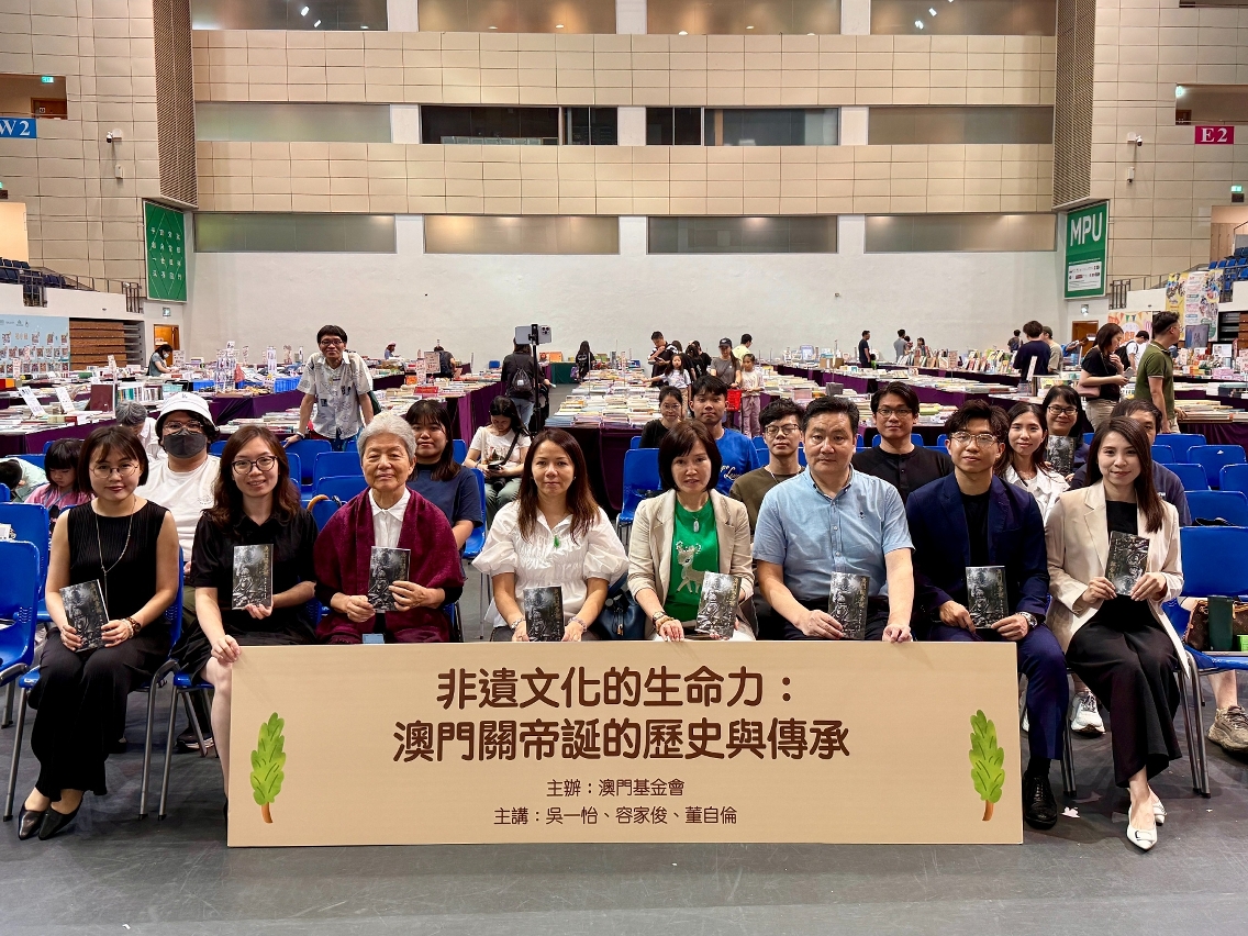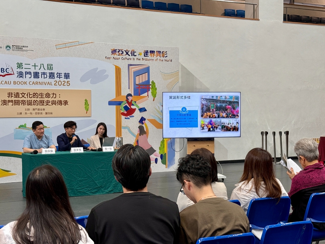 澳門基金會主辦的 “非遺文化的生命力:澳門關帝誕的歷史與傳承” 講座,已於2025年7月12日下午六時半至七時半假澳門理工大學體育館 “第二十八屆澳門書市嘉年華” 舉行。講座邀請了《澳門關帝誕》作者吳一怡、容家俊、董自倫親臨書展現場主講,共話澳門關帝文化傳承發展,吸引眾多澳門歷史文化愛好者和市民到場參與,場面熱鬧。