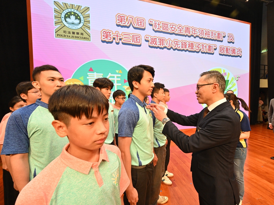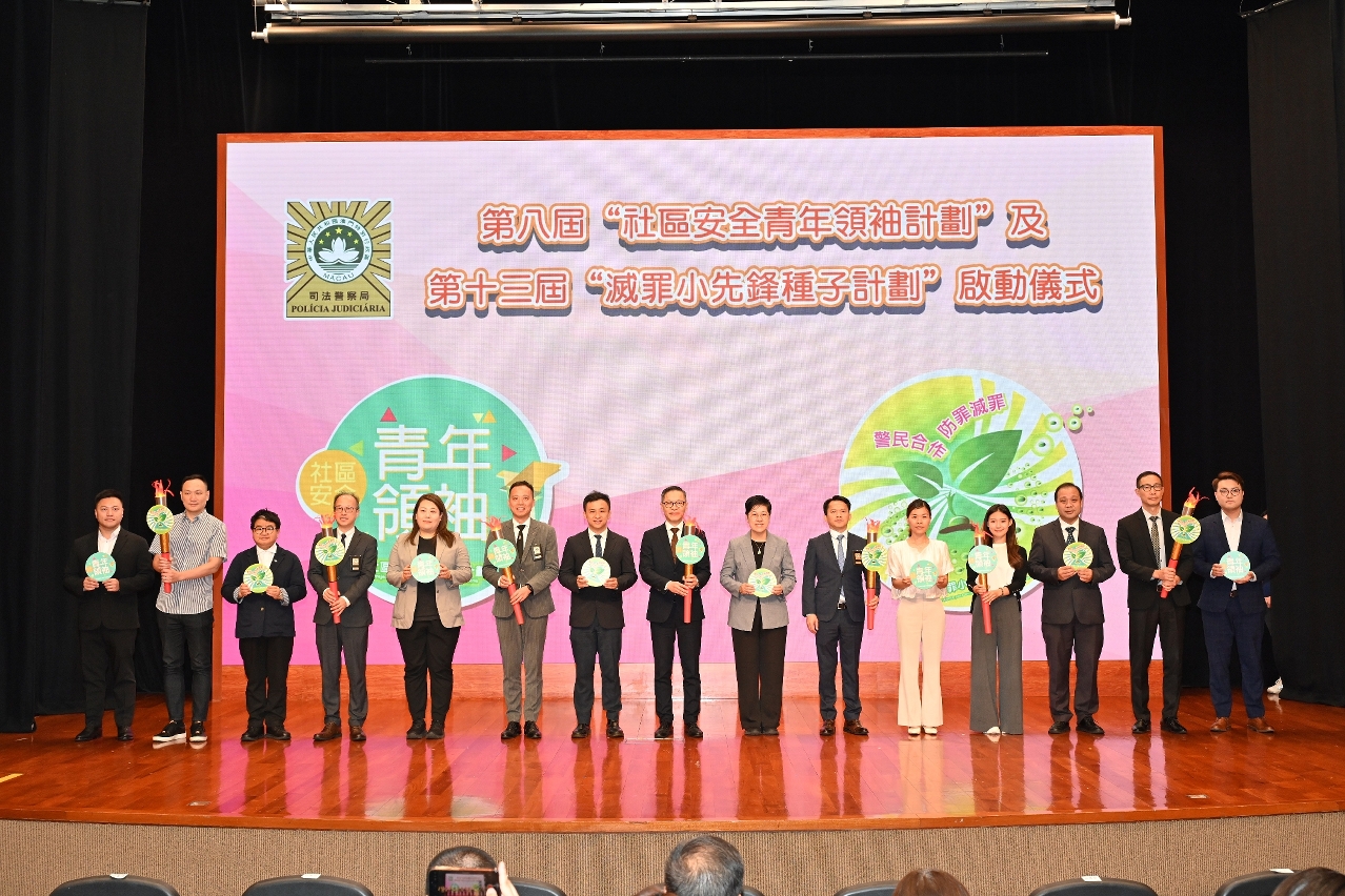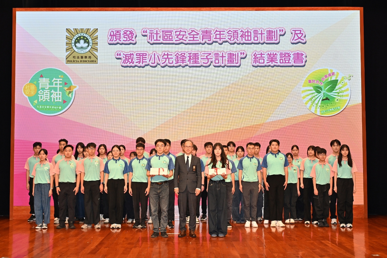 為配合澳門特區政府青年政策,增強青少年的愛國愛澳思想,提升社會責任感和法治意識,司法警察局舉辦第七屆“社區安全青年領袖計劃”及第十二屆“滅罪小先鋒種子計劃”結業禮暨新一屆計劃啟動禮。司警局薛仲明局長勉勵學員遵紀守法、維護正義,將所學所得轉化為服務社會的實際行動,為青年群體樹立榜樣,為維護國家與澳門安全貢獻青年力量。