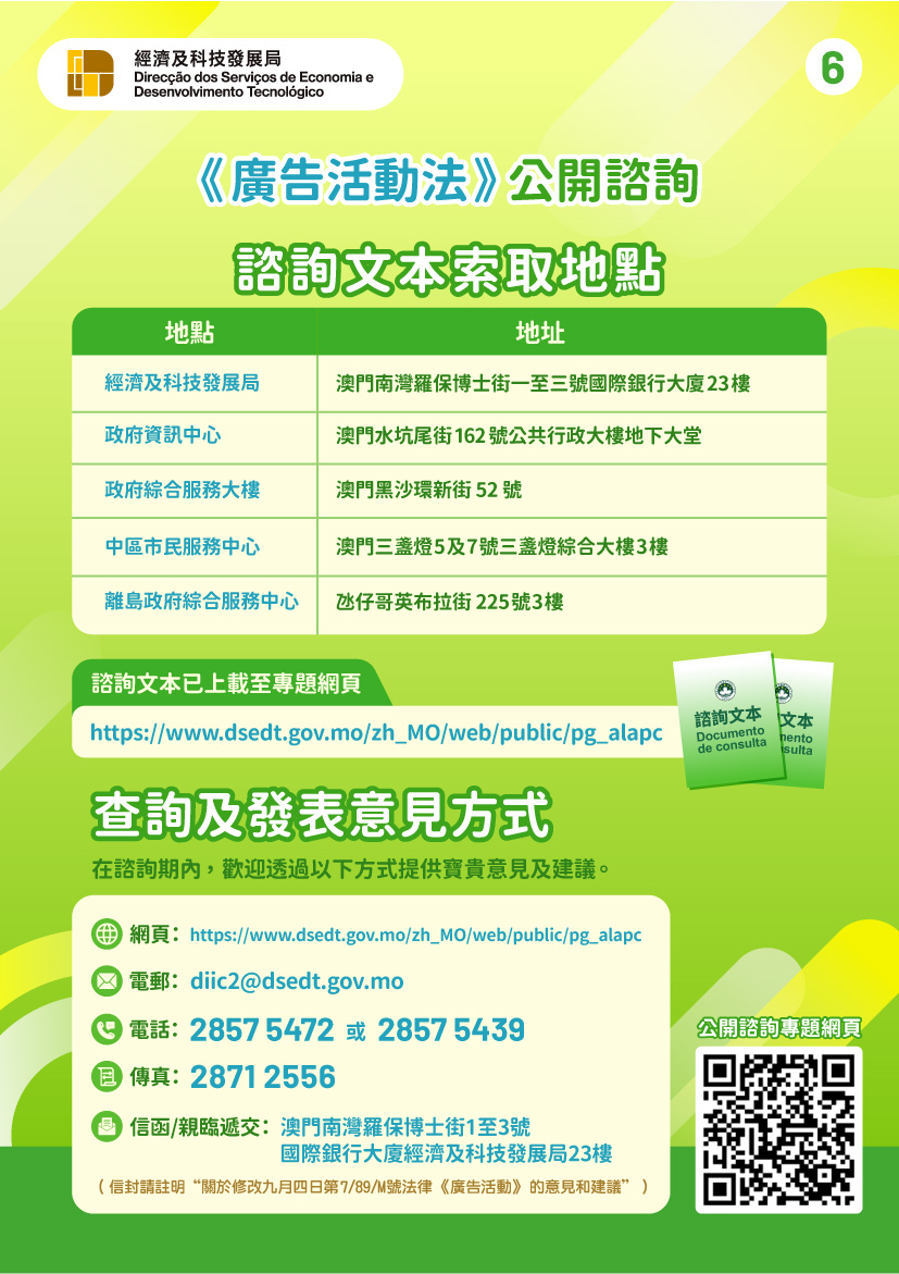 為更好地收集社會各界對修改《廣告活動法》的意見,經科局將於7月26日(星期六)下午3時至5時增設一場公眾諮詢會,歡迎市民透過專頁、掃描圖文包二維碼或辦公時間致電28575472或28575439報名。詳情可瀏覽公開諮詢專題網頁(https://www.dsedt.gov.mo/zh_MO/web/public/pg_alapc)。