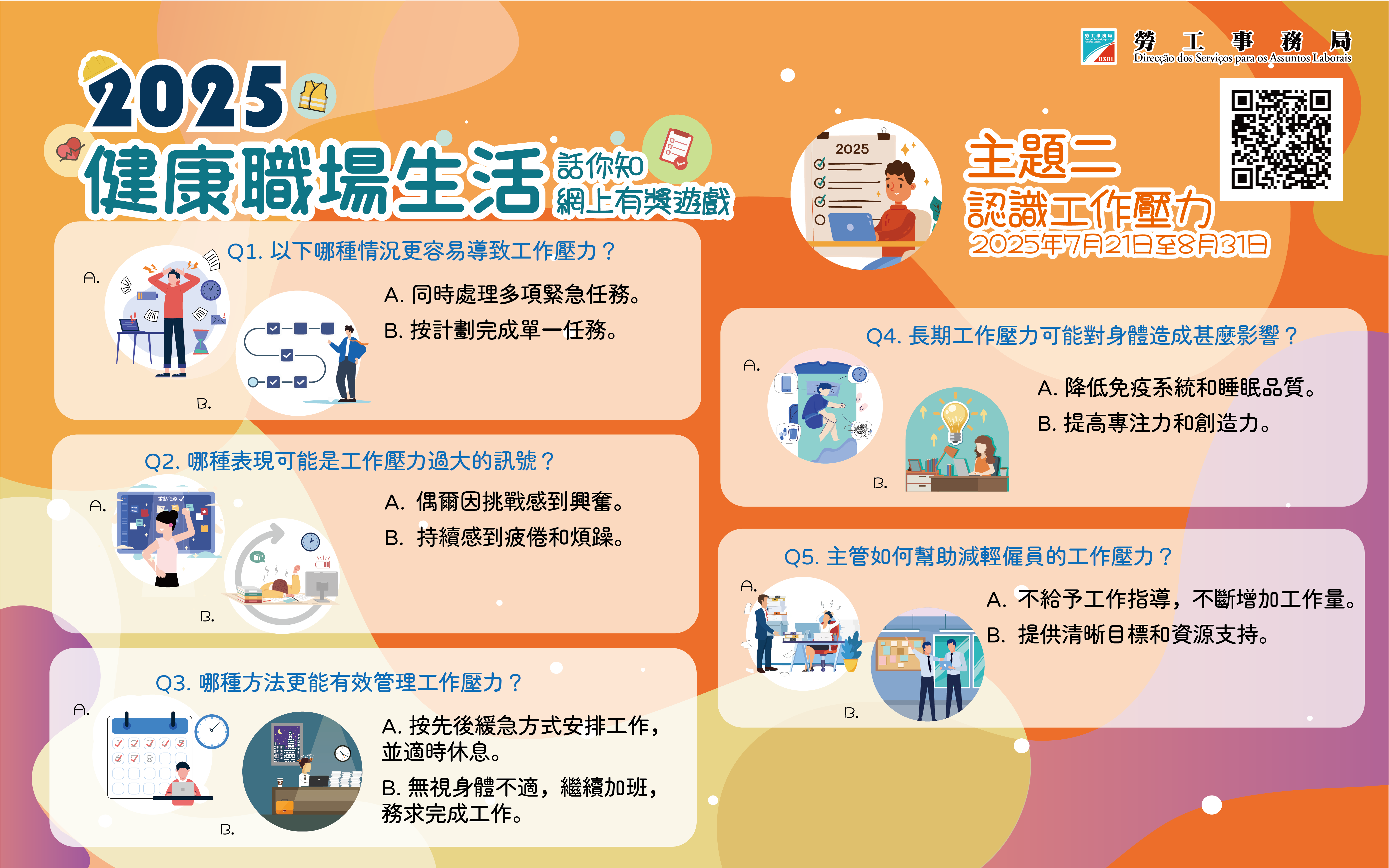 為持續提升市民對職業健康的關注,勞工局由7月21日起至8月31日期間推出第二期職業健康有奬遊戲,主題為“認識工作壓力”。歡迎有興趣的市民透過勞工事務局手機應用程式或掃描二維碼參與。