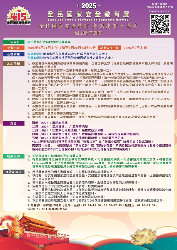 得獎名單將於“全民國家安全教育展”專題網頁、司警局網頁,以及局方微信、Facebook、Instagram、微博、小紅書等官方帳號公佈,並由專人通知得獎者獲獎事宜。遊戲詳情請參閱活動章程。如有查詢,可於辦公時間致電63301844。