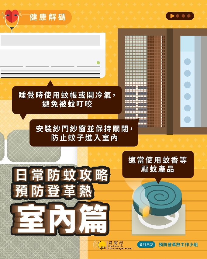 2. 防止蚊子“進入”室內,家中可使用紗窗、蚊帳或開冷氣等措施,減少被蚊叮咬機會;