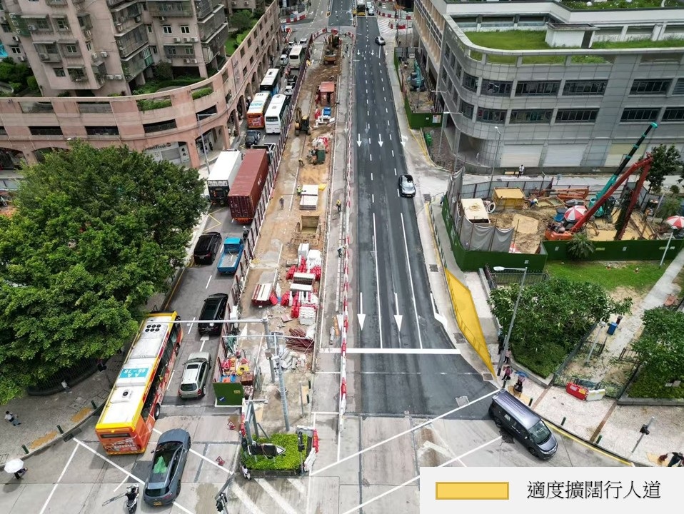公共建設局與交通事務局持續聽取社會意見,優化東北大馬路空中走廊工程的各項施工安排。其中,因應鄰近長者公寓一帶的實際情況,通過臨時調整現有措施,提升該區通行效率及保障行人安全。