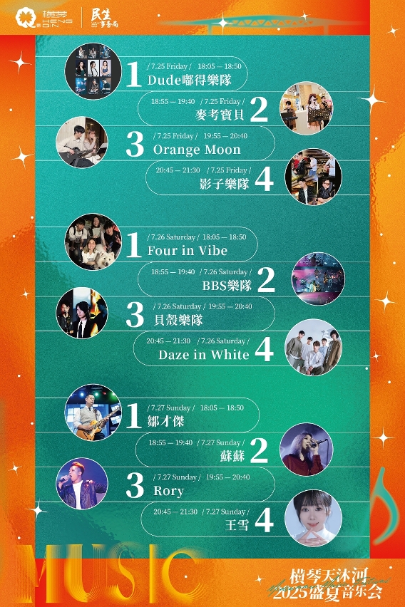 原定7月19日的演出,因天氣原因延期至7月27日(本週日)。橫琴天沐河2025盛夏音樂會本週五、六、日,以樂隊為主題,三天狂歡,動感節奏,嗨翻全場,經典與活力的融合,將帶領觀眾感受樂隊的獨特魅力。