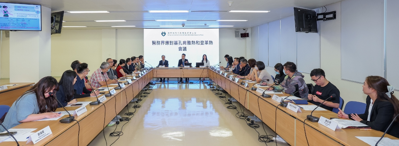 鑑於本澳鄰近地區基孔肯雅熱病例明顯增多,本澳人員往來頻繁,疾病傳入本澳風險增高,加上本澳7月已錄得2例輸入性基孔肯雅熱病例和1例本地登革熱病例,今(24)日衛生局召集本澳醫務界團體和提供相關醫療服務的非牟利團體或機構舉行了“醫務界聯合應對基孔肯雅熱和登革熱工作會議”,以加強業界對蚊媒傳播疾病防控措施的了解,與社會各界共同防治相關傳染病並提升居民對預防相關傳染病的認識。