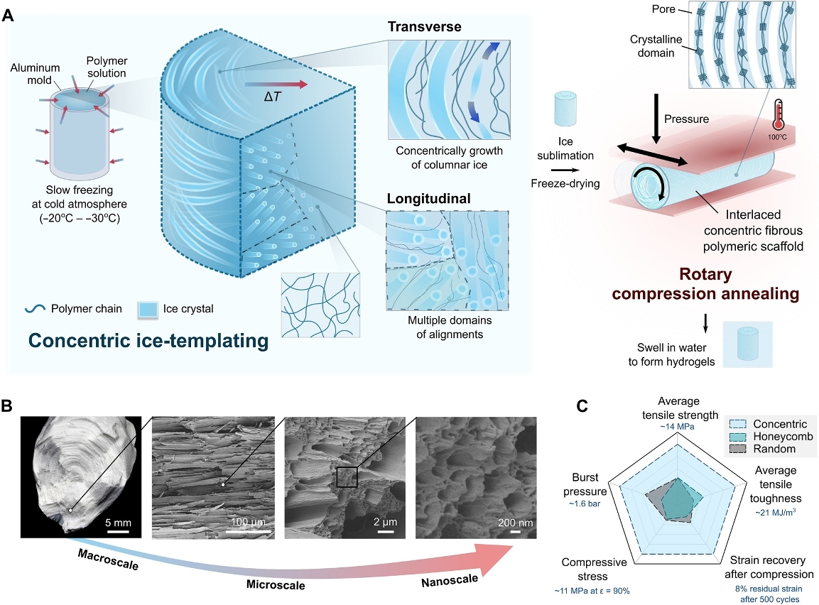 自然界中,如椎間盤、血管、魚鰾等生物組織因具有環向纖維狀結構而具備優越的力學性能。傳統冰模板法通過控制冰的定向生長來製造仿生結構的水凝膠,只能製造有限結構,且成本高昂、效率低下,嚴重限制了仿生水凝膠在性能上與自然材料的匹配。研究團隊發現,通過慢速冷凍能誘導冰晶平行於冷源生長,據此研發出“同心冰模板法”,首次成功構建新的環向纖維結構。此外,團隊亦改良現有退火工藝,開發出旋轉壓縮退火方法,令水凝膠在保持85 wt.%含水量的情況下,具備高強度、高韌性、抗疲勞性能、可壓縮性、高爆破壓等多重機械性能,使材料微觀結構更加緻密,進一步提升結晶度。
