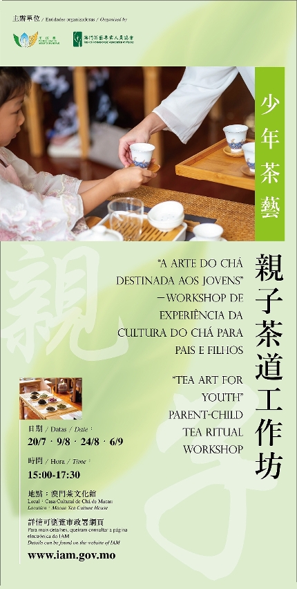 三場“少年茶藝”親子茶道工作坊將分別於八月九日、二十四日及九月六日下午三時至五時半,於澳門茶文化館舉行。主題分別為“現代泡茶不無聊,傳承與新潮流”、“小小紫砂玩家,認識神奇的紫砂壺”、“功夫茶小達人,澳門功夫茶體驗營”。每場工作坊設15組名額,每組兩人,由一名10至16歲少年及其家長或監護人組成。而為了增添仿如古人品茗的氛圍感,建議參加者在活動期間穿上中華服飾,現場將安排專業攝影師為參加者留影紀念。