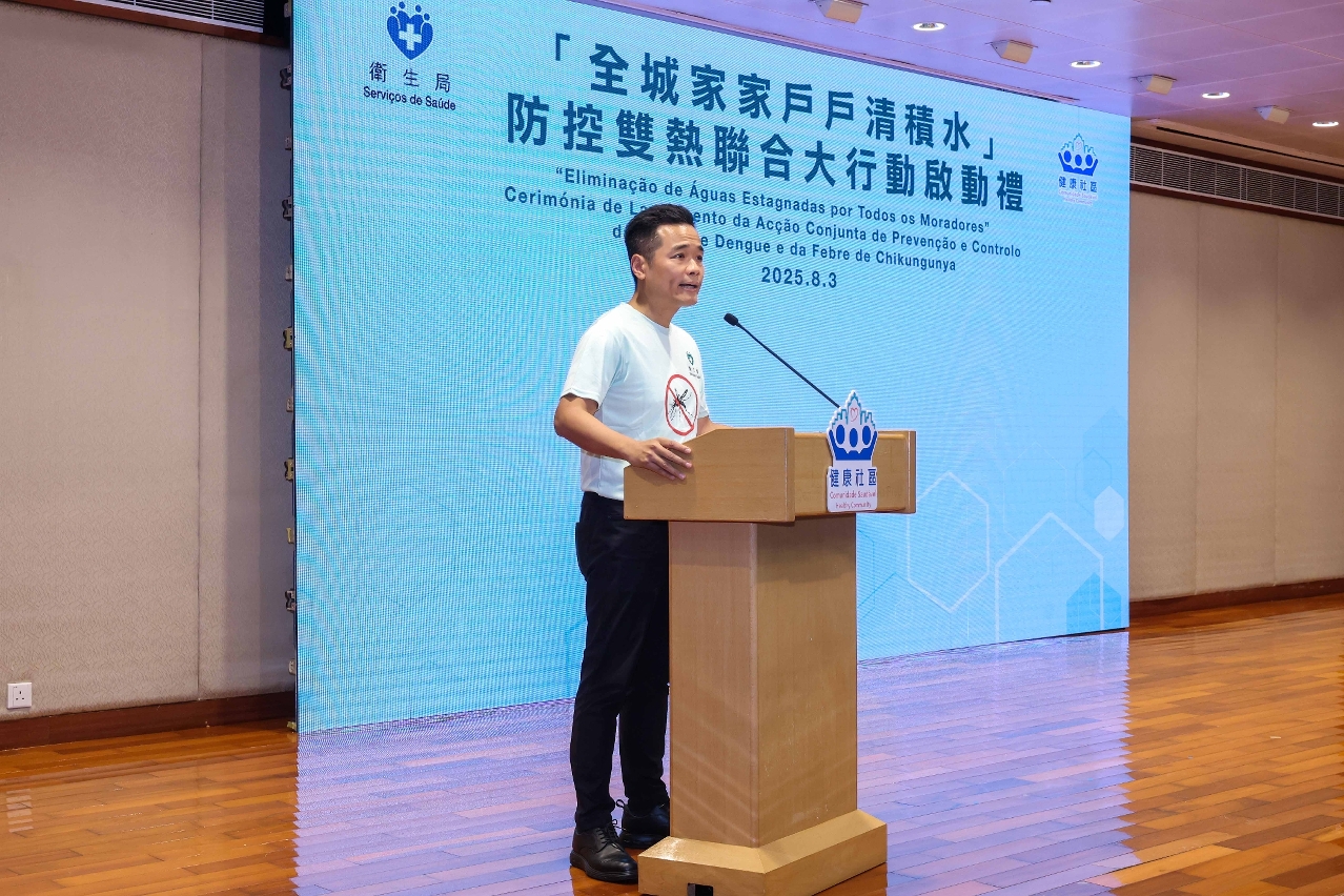 衛生局今(3)日舉行“全城家家戶戶清積水”防控雙熱聯合大行動啟動禮,社會文化司司長柯嵐、中央人民政府駐澳門特別行政區聯絡辦公室宣傳文化部部長萬速成、衛生局局長羅奕龍、市政署市政管理委員會主席周偉迎、社會工作局局長韓衛、新聞局代局長黃樂宜、社會文化司司長辦公室顧問呂紅、教育及青年發展局副局長黃嘉祺、房屋局副局長郭惠嫻等多個部門及社團代表出席。衛生局及社團代表於啟動禮後組成不同小隊深入社區“挨家挨戶”宣導清除家居積水和預防蚊患的方法,重點提升居民對孳生源的識別和清除的能力,共同防範蚊媒傳播疾病。