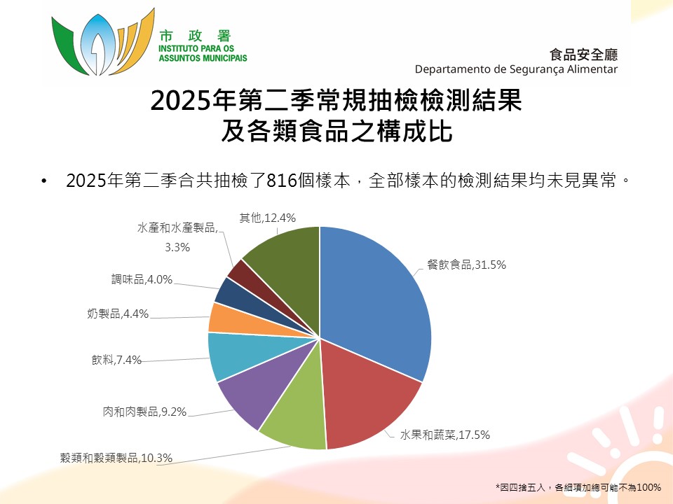 市政署第二季合共抽檢八百一十六個食品樣本中,包括五百五十九個一般市售食品樣本和二百五十七個餐飲食品樣本,抽檢點涵蓋本澳各區食肆、外賣店、熟食中心、超級市場、零售鮮活食品場所及雜貨店等。市政署對相關食品樣本進行了檢測,當中微生物檢測項目包括沙門氏菌屬、單核細胞增生李斯特氏菌、蠟樣芽孢桿菌等常見微生物參數;化學檢測項目包括重金屬、食品添加劑及禁用物質等;全數樣本檢測結果均未見異常。