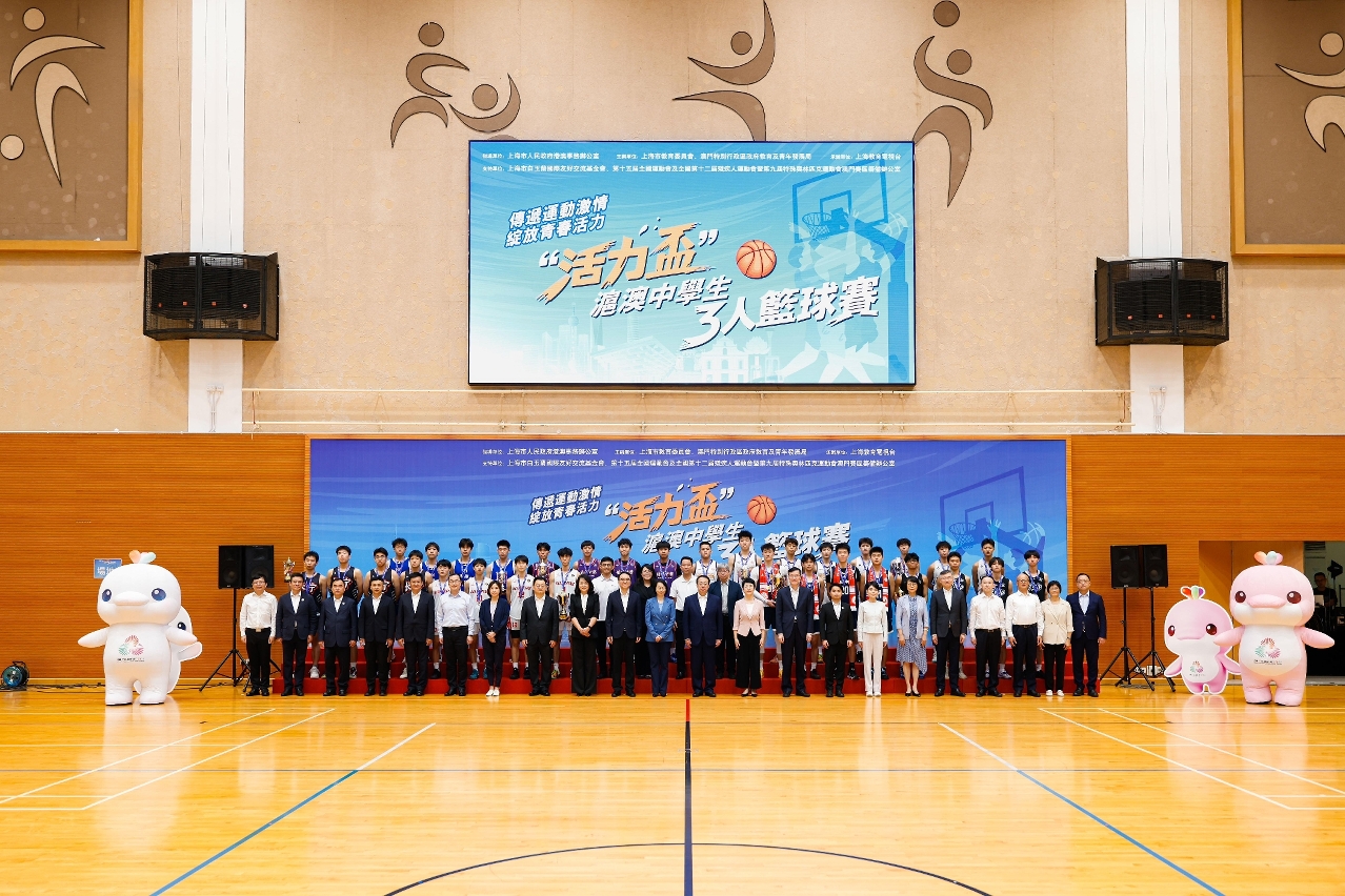 綻放青春活力—“活力盃”滬澳中學生3人籃球今日(8月7日)在中葡職業技術學校體育館圓滿結束,並隨即舉行頒奬儀式。上海市市長龔正、社會文化司司長柯嵐、上海市副市長解冬、中聯辦教育與青年工作部部長李雪飛、社會文化司司長辦公室主任林媛、教育及青年發展局代局長丁少雄、副局長黃嘉祺,上海市政府秘書長馬春雷、副秘書長周亞明,上海市政府港澳事務辦公室主任馬穎慧、第十五屆全國運動會及全國第十二屆殘疾人運動會暨第九屆特殊奧林匹克運動會澳門賽區籌備辦公室副主任傅斯娜、中共上海市委社會工作部部長黃紅、共青團上海市委員會副書記鄔斌等嘉賓出席。