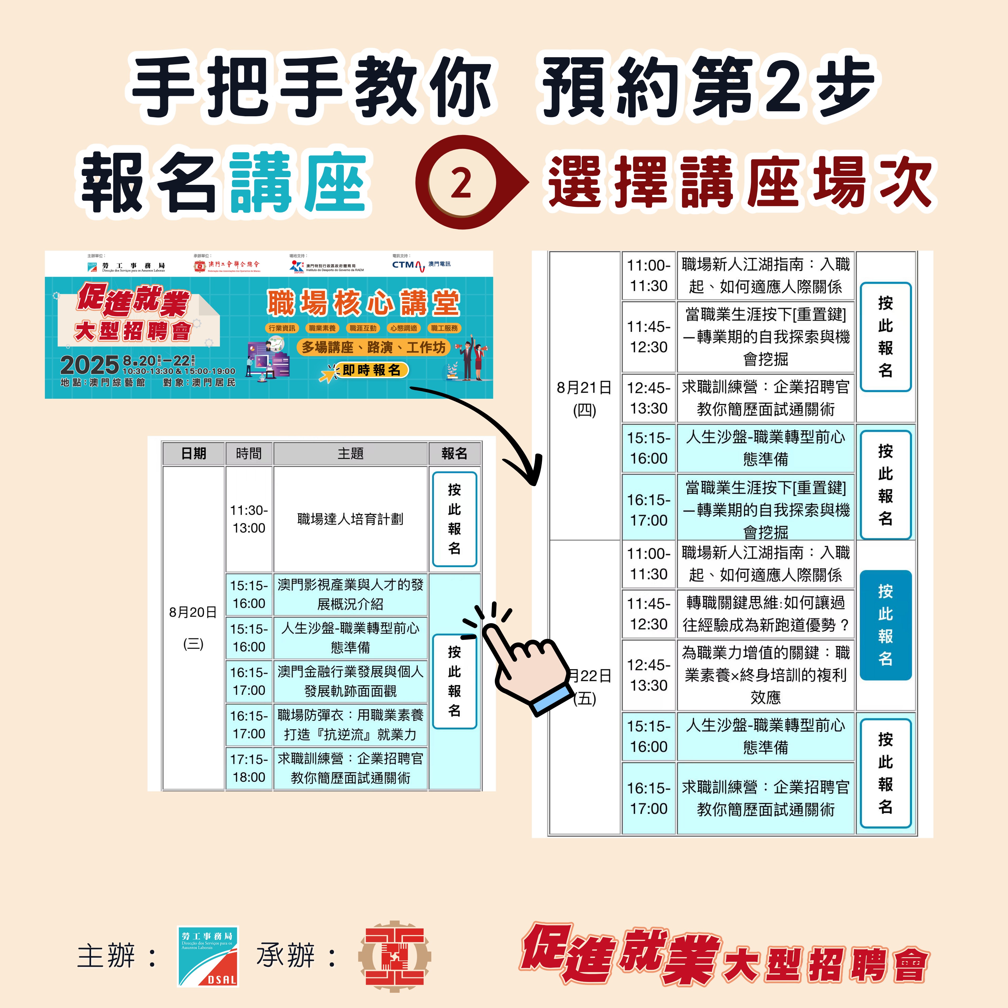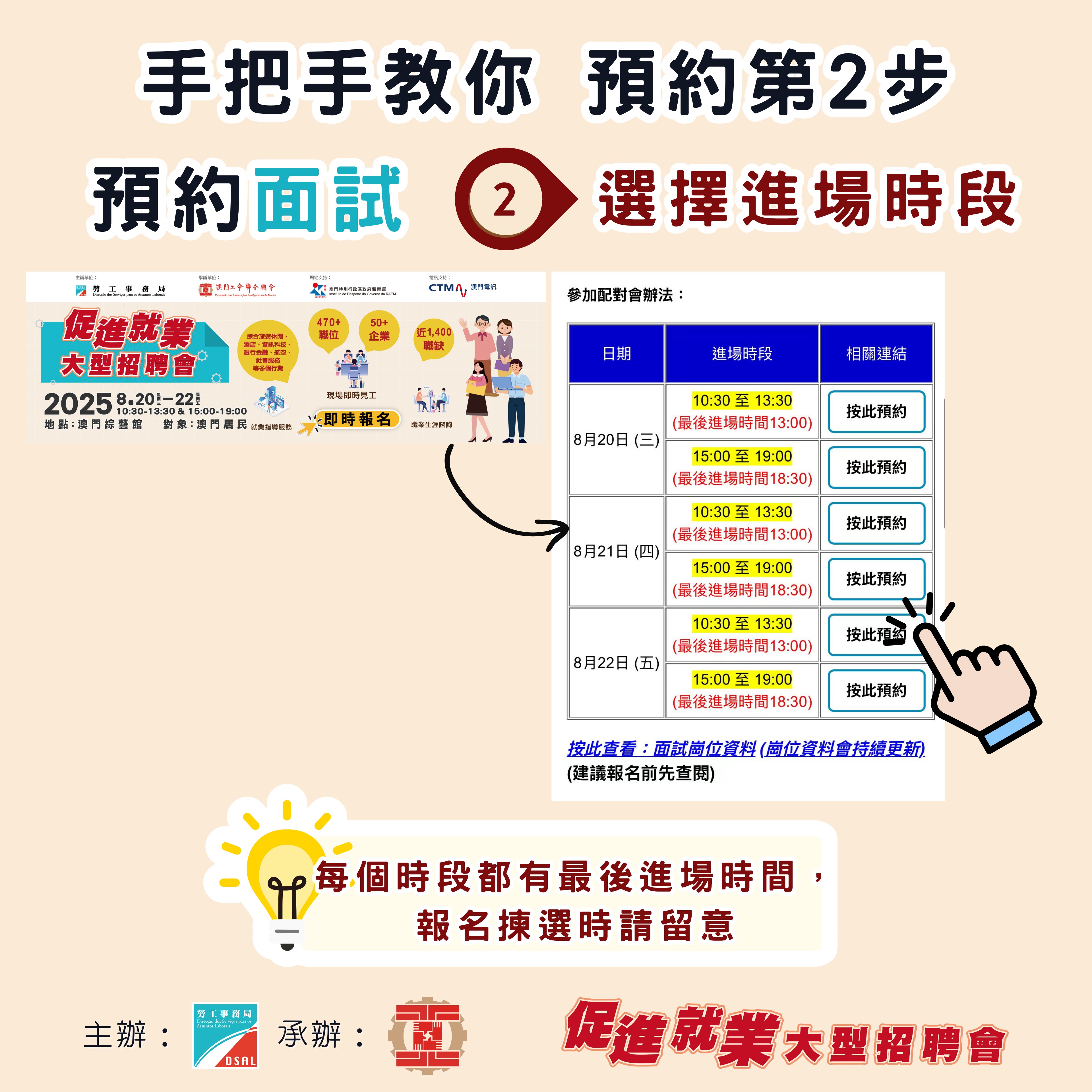 是次招聘會將於8月20日至22日一連三天假澳門綜藝館舉行,每日設兩個入場時段,分別上午10時30分至下午1時30分(最後進場時間為下午1時)及下午3時至7時(最後進場時間為下午6時30分)。有意參加的澳門居民可由即日起至8月18日登入以下專頁了解詳情及預約參加:https://www.dsal.gov.mo/zh_tw/standard/employment_promotion_jobfair.html,名額有限,欲報從速。