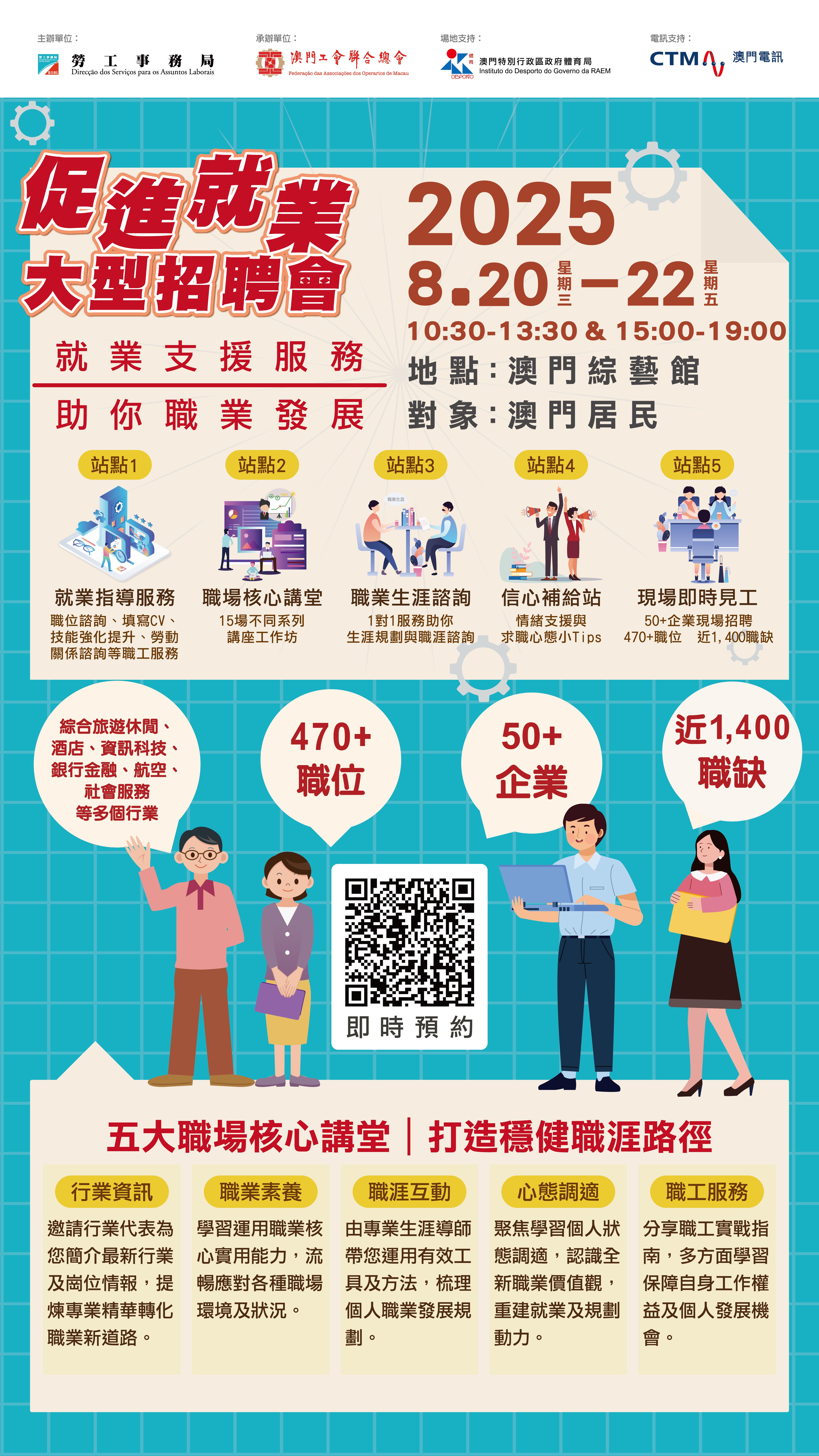 為全力促進各階層求職者對接就業及助力居民向上流動,由勞工事務局主辦、澳門工會聯合總會承辦的“促進就業大型招聘會”於8月20日至22日假澳門綜藝館舉行,由即日起至8月18日接受網上報名。