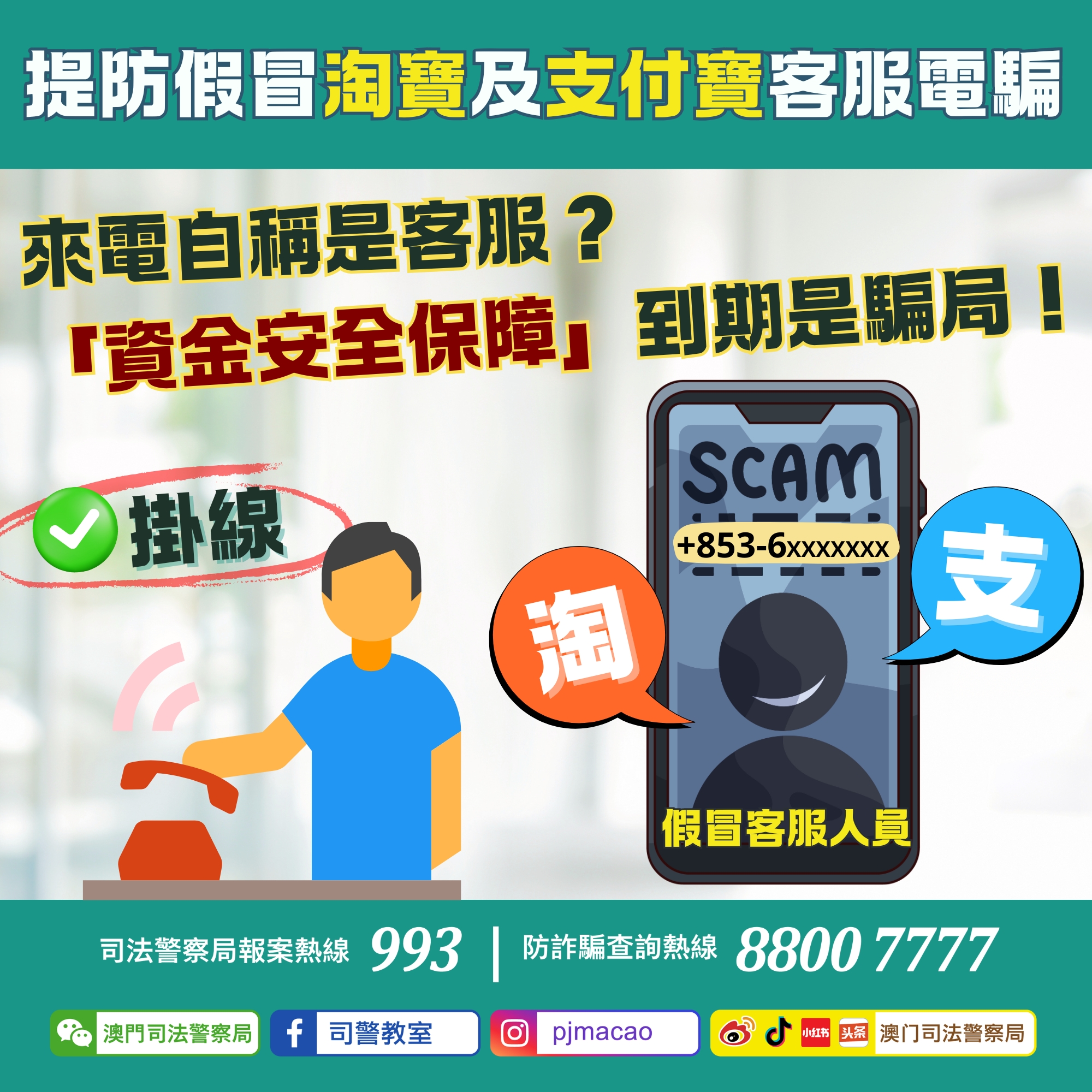 司法警察局自8月11日起,透過反詐程式及防詐騙查詢熱線,分別接獲至少16名市民舉報,報稱收到冒充「淘寶」及「支付寶」客服的詐騙電話,而來電均顯示「+853」開首的流動電話號碼。騙徒在來電中會聲稱事主上述應用程式內的「資金安全保障」即將到期,若不取消將被收取高額費用。隨後,騙徒再冒充其他金融機構的「客服」聯絡事主,訛稱協助取消保險手續,伺機詐騙金錢。
