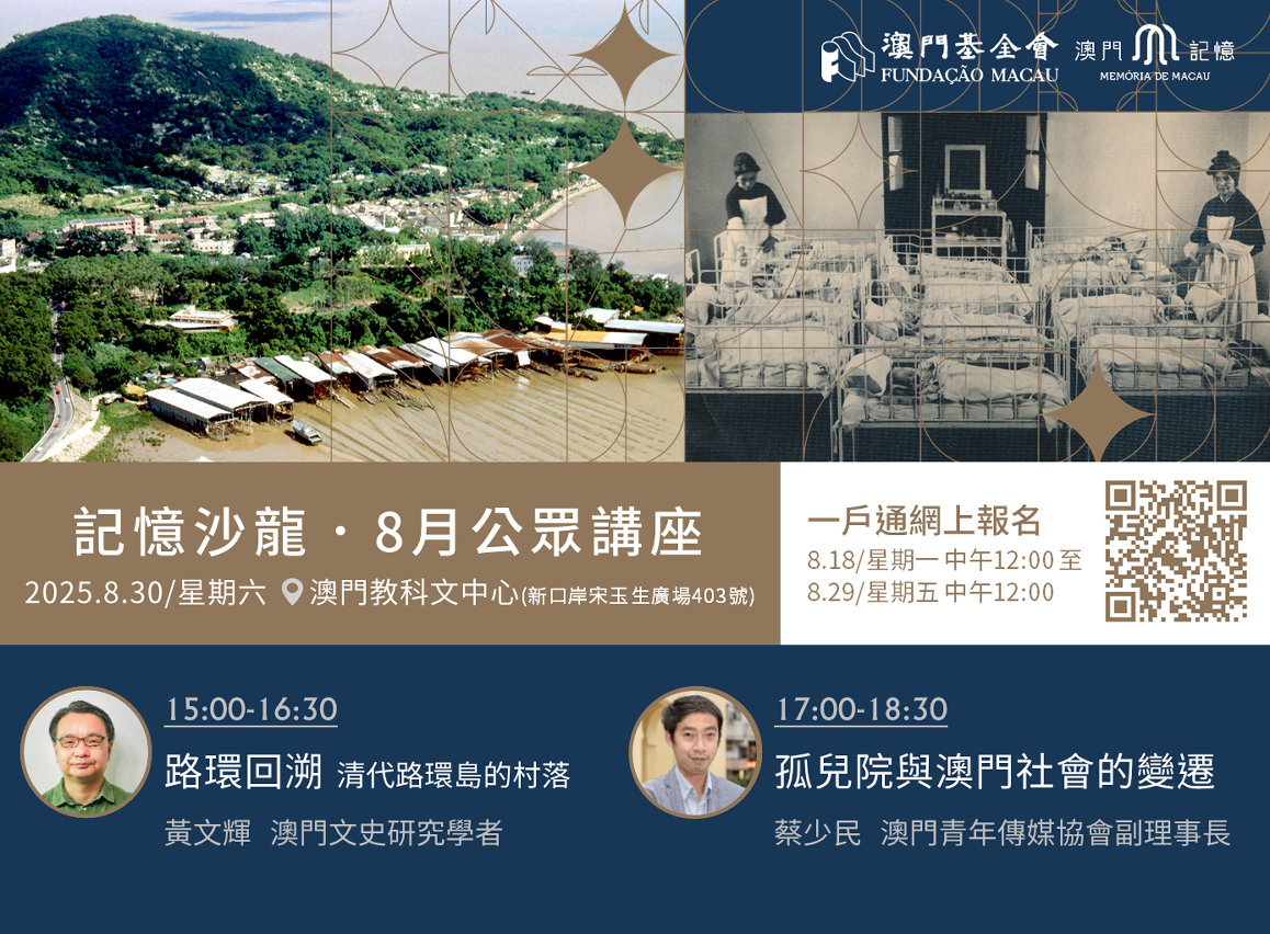 8月“記憶沙龍”公眾講座將於8月30日(星期六)下午於澳門教科文中心舉行,分別由澳門文史研究學者、攝影師黃文輝於3時至4時半主講“路環回溯——清代路環島的村落”以及由澳門青年傳媒協會副理事長蔡少民於5時至6時半主講“孤兒院與澳門社會的變遷”。有興趣的市民可於8月18日(星期一)中午12時起至8月29日(星期五)中午12時前透過“澳門公共服務一戶通”手機應用程式或通過以下連結https://activity.mo.gov.mo報名,名額有限,先到先得,歡迎市民踴躍報名。