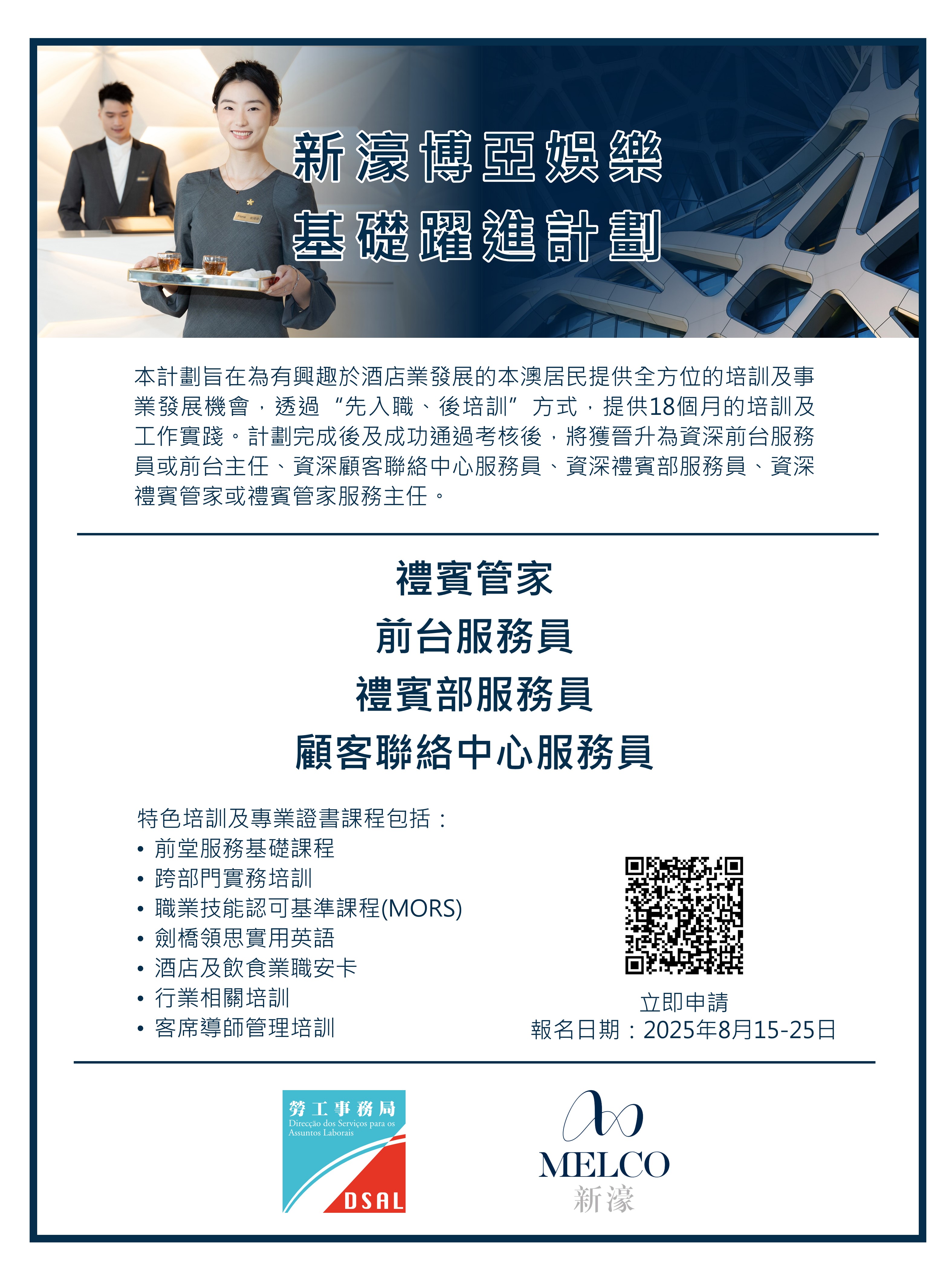 為有意投身酒店業發展的本澳居民,提供全方位的培訓及事業發展機會,勞工事務局(下稱“勞工局” )和新濠博亞娛樂有限公司(下稱“新濠博亞”)合作推出“新濠博亞娛樂基礎躍進計劃—酒店營運”(下稱“計劃” ),以“先入職、後培訓”方式,為有興趣從事酒店業範疇的本澳居民,提供事業發展機會,計劃由8月15日起接受申請。