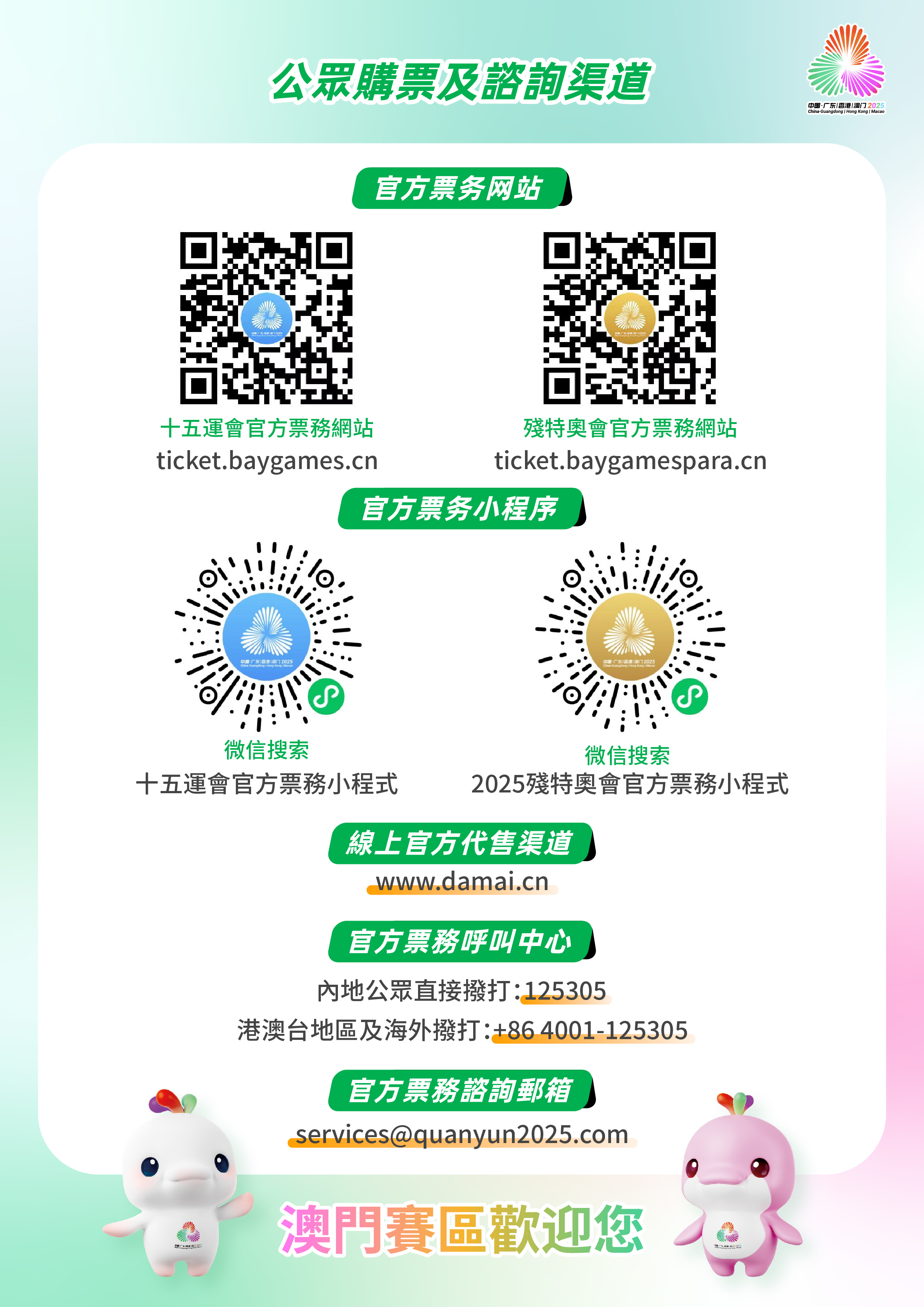 為更好地服務購票公眾,十五運會和殘特奧會組委會設立票務呼叫中心,內地公眾可直接撥打125305,港澳台地區及海外可撥打+86 4001-125305,或電郵至services@quanyun2025.com 查詢。