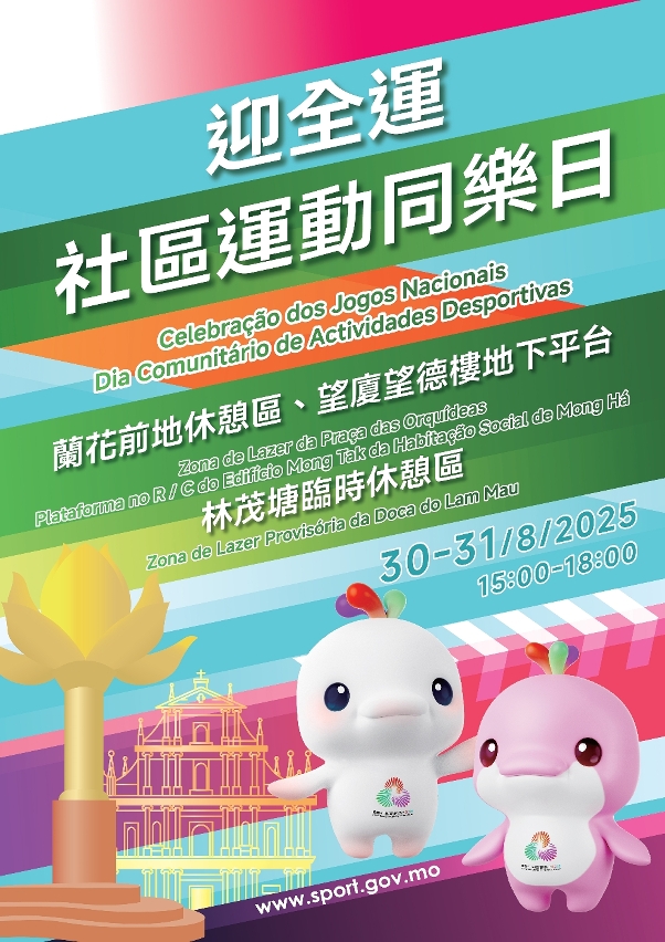 為增進市民對十五運會和殘特奧會澳門賽區比賽項目的認識,同時推動全民運動風氣,「迎全運x社區運動同樂日」最後一週活動將於本周末(8月30日至31日)舉行。活動地點移至蘭花前地休憩區、望廈望德樓地下平台及林茂塘臨時休憩區,每日下午3時至6時開放,歡迎全澳市民踴躍參與。