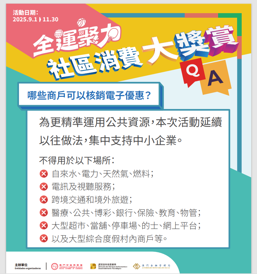 為方便消費者識別,主辦單位陸續為全澳2萬間可核銷優惠的商戶張貼及派發海報和座枱卡。不可核銷優惠的交易場景與以往相同,市民可於活動專題網頁查閱。其他內容及詳情,亦可查閱專頁或於辦公時間致電查詢熱線2857 5472或2857 5439。