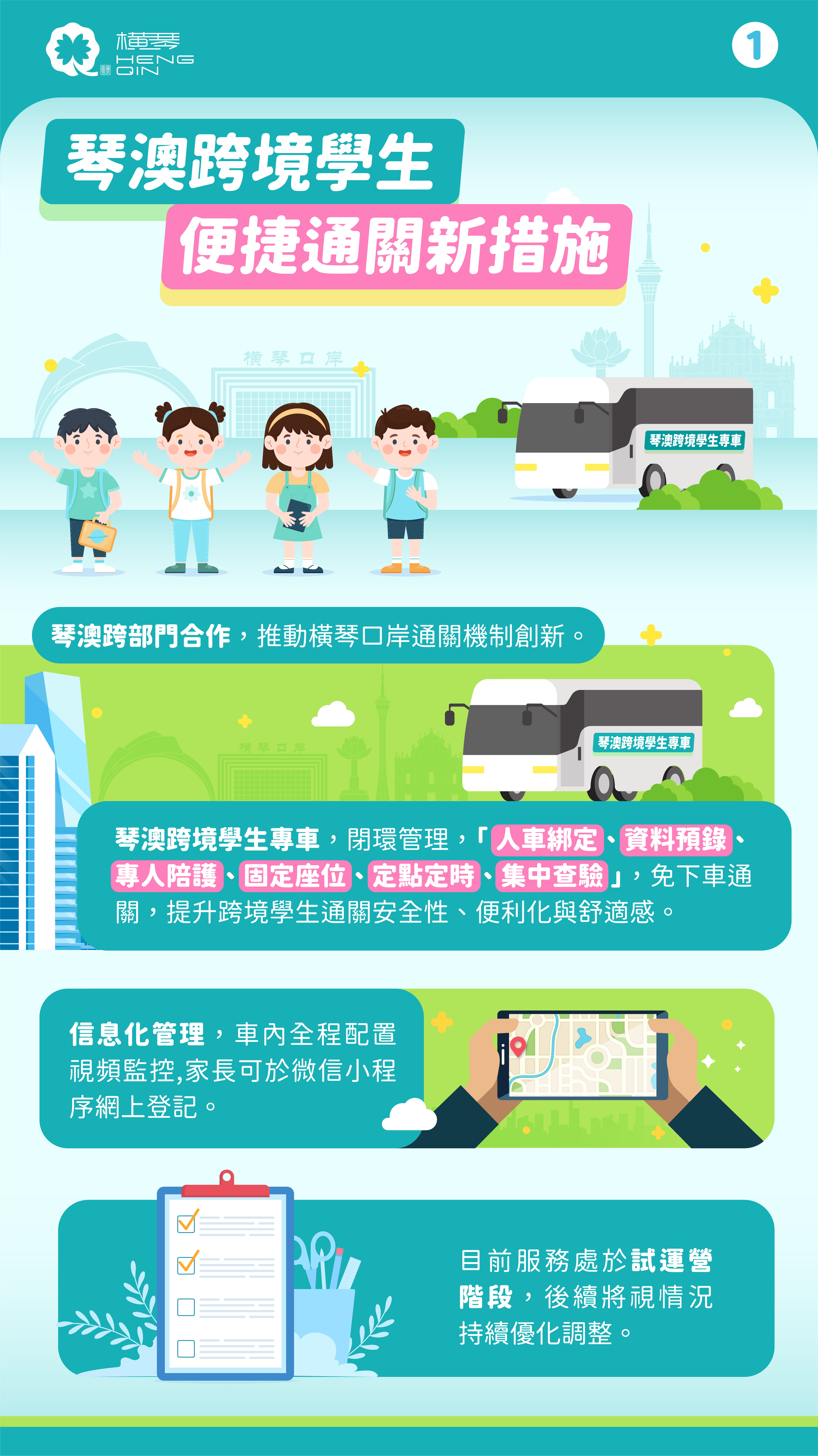 琴澳跨境學生專車服務是琴澳兩地政府深化合作的重要實踐成果。為確保服務順利實施,琴澳雙方成立聯合工作專班,兩地超過10個部門通力合作,特別是珠海出入境邊防檢查總站(橫琴邊檢站)、拱北海關(橫琴海關),以及澳門海關、澳門治安警察局、澳門保安部隊事務局、澳門教育及青年發展局、澳門衛生局和澳門交通事務局的關鍵支持和密切配合,為服務順利落地提供了堅實保障。