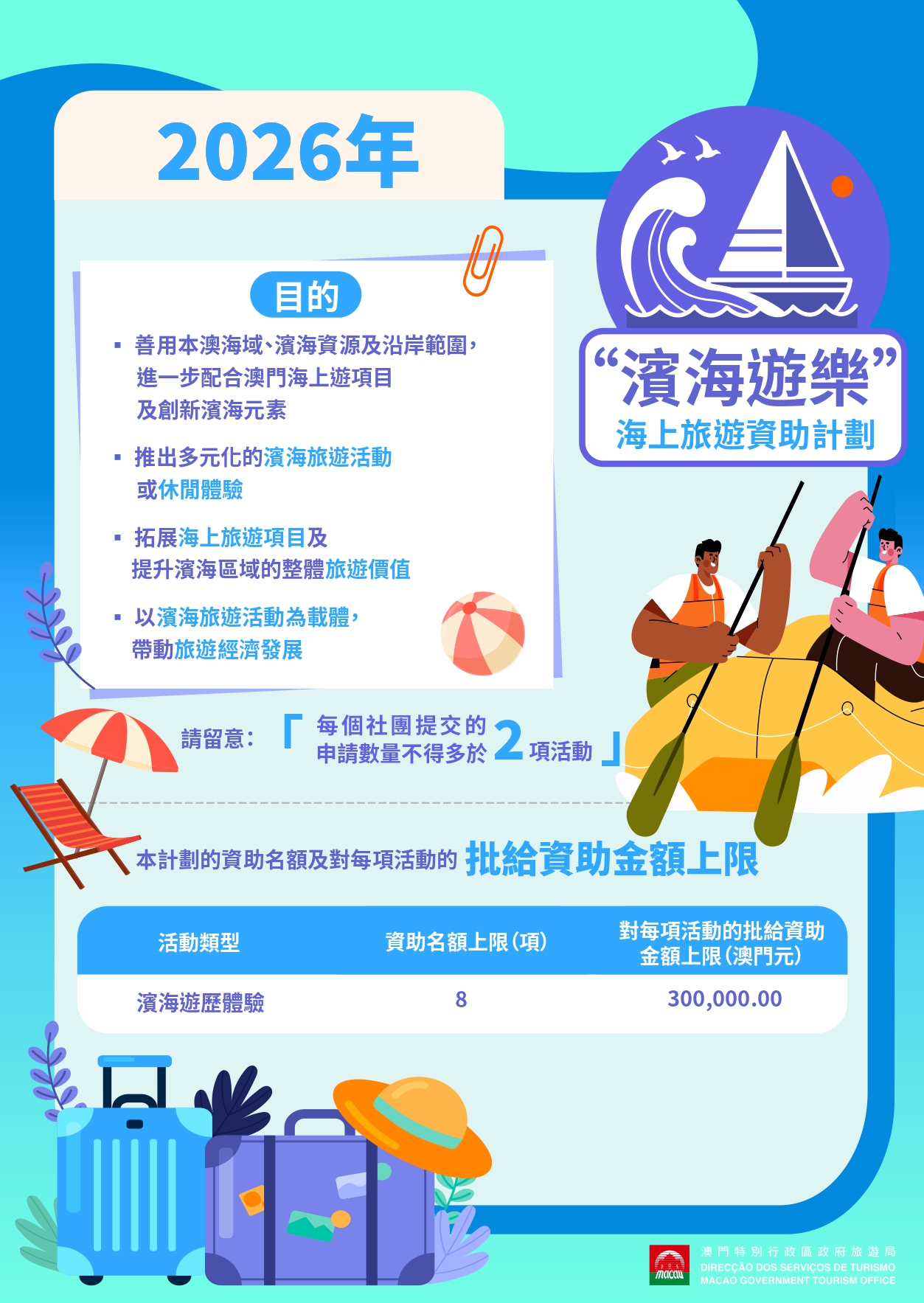 旅遊局“周遊列澳”社區旅遊資助計劃、“味歷澳門”美食推廣資助計劃和“濱海遊樂”海上旅遊資助計劃於2025年9月12日至10月3日接受申請,申請須以商社通實體使用者帳戶登入旅遊局“資助計劃(2026年)”專頁提交。旅遊局將於9月11日舉行線上講解會,歡迎有興趣的社團參加了解詳情。