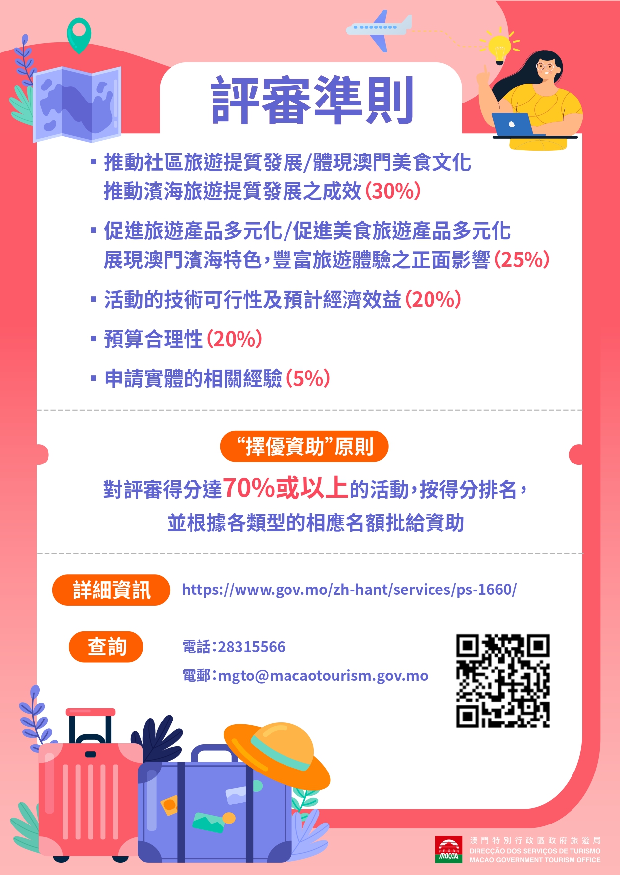 旅遊基金就各資助計劃制定了針對性的評審準則,以“擇優資助”為原則,審慎評估及分析所有申請。有關2026年三項資助計劃的申請詳情,請瀏覽https://www.gov.mo/zh-hant/services/ps-1660/。