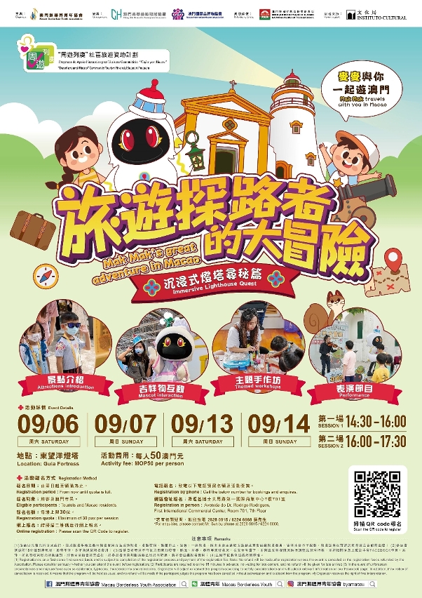 “旅遊探路者的大冒險 - 沉浸式燈塔尋秘篇”於9月6日至14日期間逢周六日下午在東望洋燈塔舉行。澳門旅遊吉祥物“麥麥”與執業導遊以澳門旅遊大使的身份,透過生動有趣的卡通人偶互動方式介紹社區景點,現場設小型流動文藝演出,提升文旅體驗。