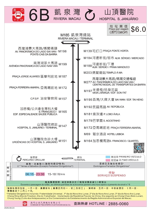 此外,隨着內港雨水泵站及下水道工程與相關場站優化工程相繼完工,6B路線自9月23日起恢復以“凱泉灣總站”作為發車總站,並增停“西灣湖景大路/媽閣交通樞紐"站,同時取消停靠“媽閣交通樞紐"站及“河邊新街/凱泉灣"站。而配合俾若翰街沿岸休憩區工程完工,H2路線同日恢復停靠近新建泵房之“筷子基街/綠楊花園”分流站(往沙梨頭北街方向,距原站位約60米)。為進一步提升服務覆蓋面,61路線亦將新增停靠“青茂/青洲坊"站、“船澳街"站、“司打口"站、“河邊新街/街市"站及“河邊新街/李道巷"站,詳細安排可參閱路線指南。