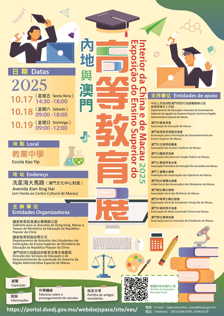 國家教育部港澳台事務辦公室、高校學生司與澳門特別行政區政府教育及青年發展局將於2025年10月17至19日舉辦“內地與澳門高等教育展2025”。展覽將以實體展覽為主,並配合專題網頁展示高校資訊。參展高校將於教業中學為參加者現場解答疑問,同時,展覽期間將舉辦一系列不同主題的升學講座,及邀請曾於不同地區升學的校友分享經驗,為有意於澳門及赴內地升學的學生、其家長和老師全方位了解內地和澳門的升學資訊。