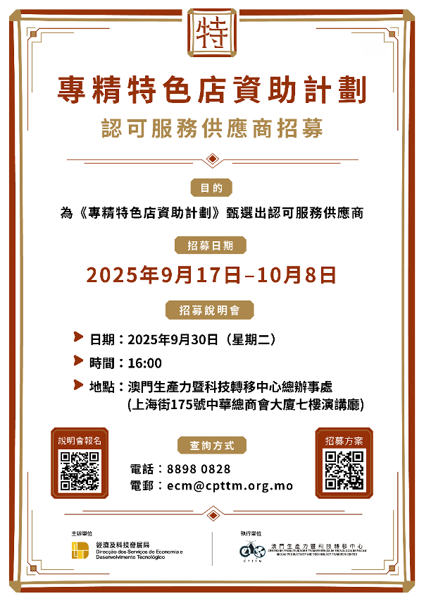 供應商招募期由2025年9月17日至10月8日。歡迎有興趣的供應商派員參與9月30日下午4時在生產力中心總辦事處演講廳(上海街中華總商會大廈7樓演講廳)舉行的招募說明會,線上報名網址為 https://events.cpttm.org.mo/seminar/446 。如有疑問,請於辦公時間內致電8898 0828與吳先生聯繫,或電郵至ecm@cpttm.org.mo查詢。