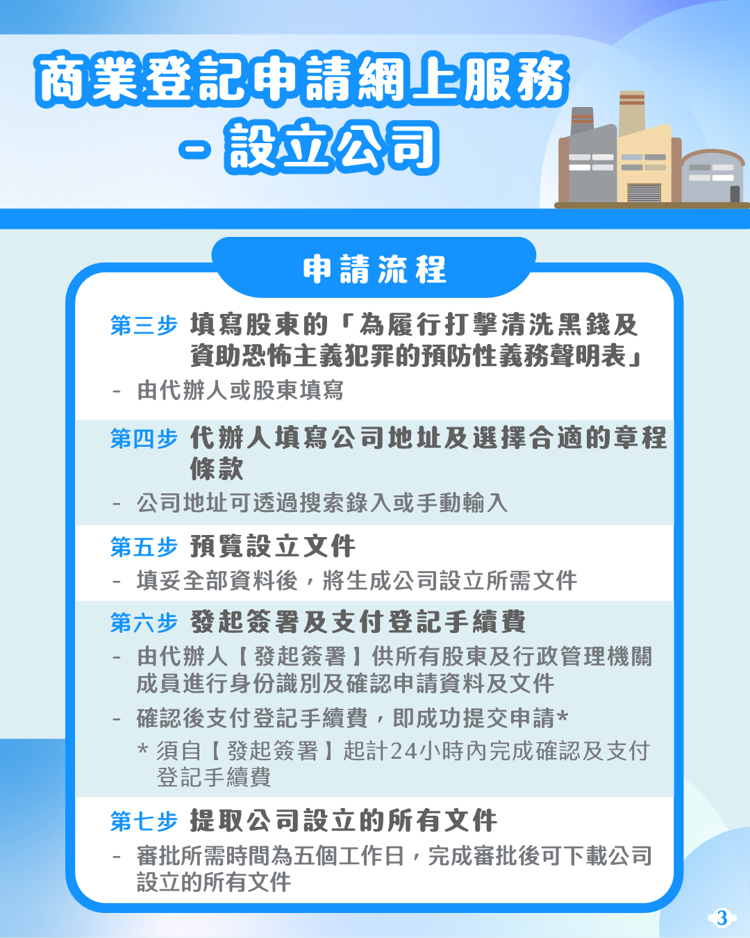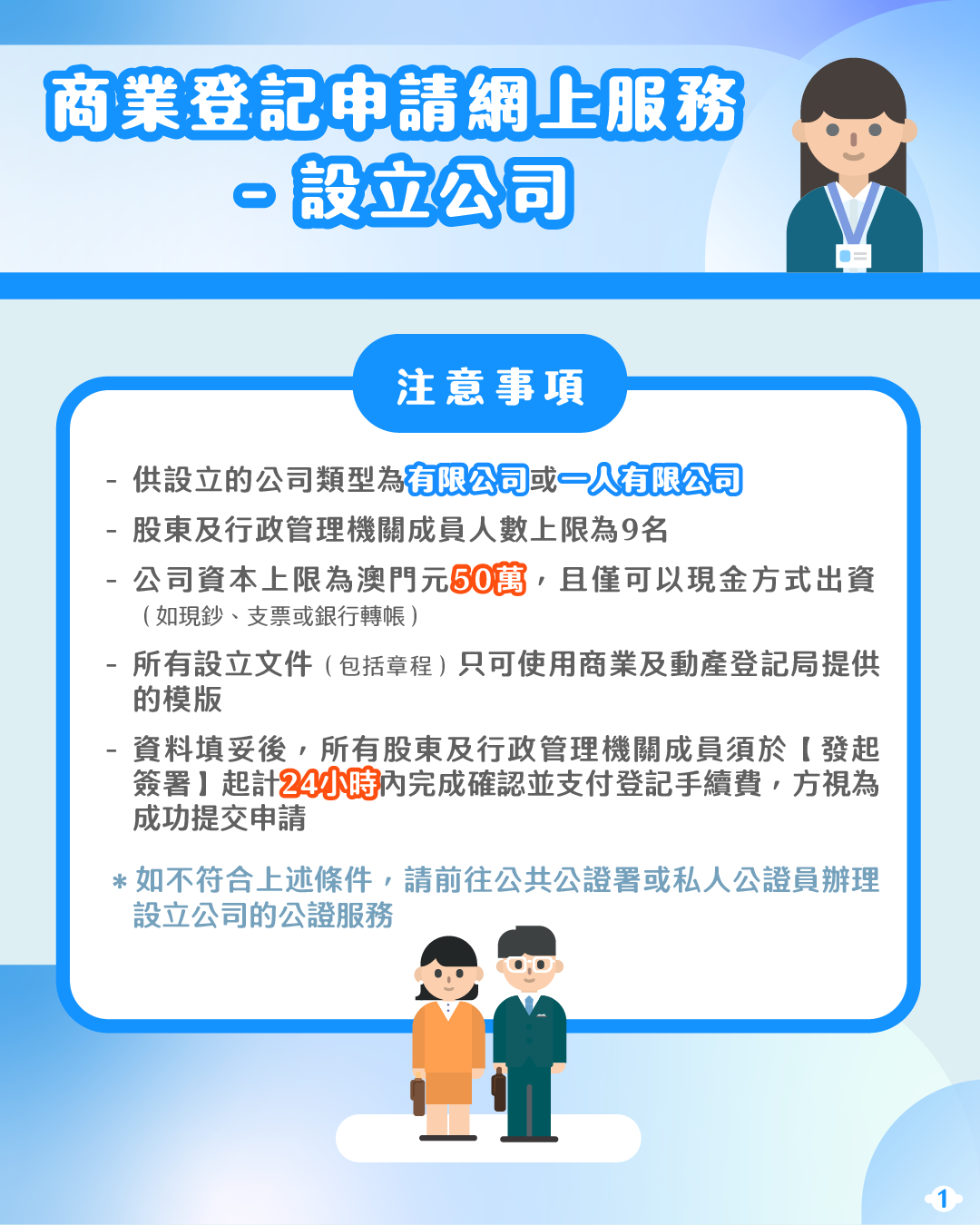 有意設立公司的人士可透過“商社通”提交公司設立的申請,並使用預設格式的線上文件模版製作公司設立的各類文件,無須再親臨公證署及登記局,即可輕鬆完成公司設立程序,提高企業開辦效率。此外,變更公司地址也可透過“商社通”辦理,包括提交申請、繳付登記費及取得登記副本,繼續實現指尖辦事模式,為用戶帶來最大便利。