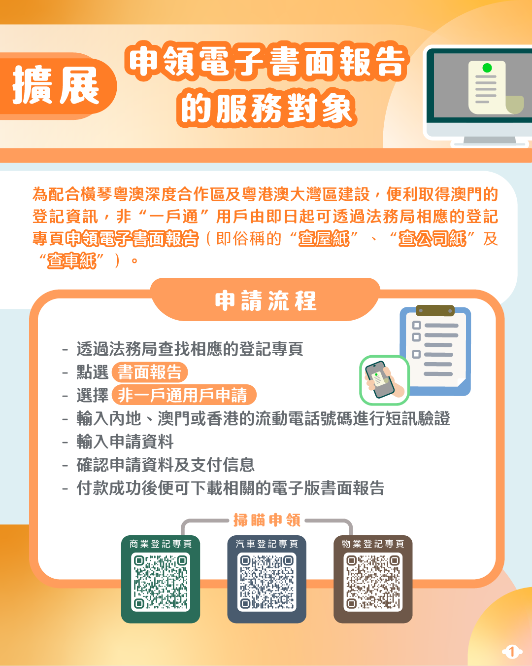 為配合橫琴粵澳深度合作區及粵港澳大灣區的建設,便利內地及香港居民、政府或私人機構等取得澳門的物業、商業和汽車登記的資訊,法務局將申領電子書面報告(包括查屋紙、查公司紙及查車紙)的服務對象擴展至非“一戶通”用戶。申請人可於法務局的物業、商業及汽車專頁內完成申請並付款,便可下載相關電子版書面報告,隨時隨地取得登記的最新資訊。