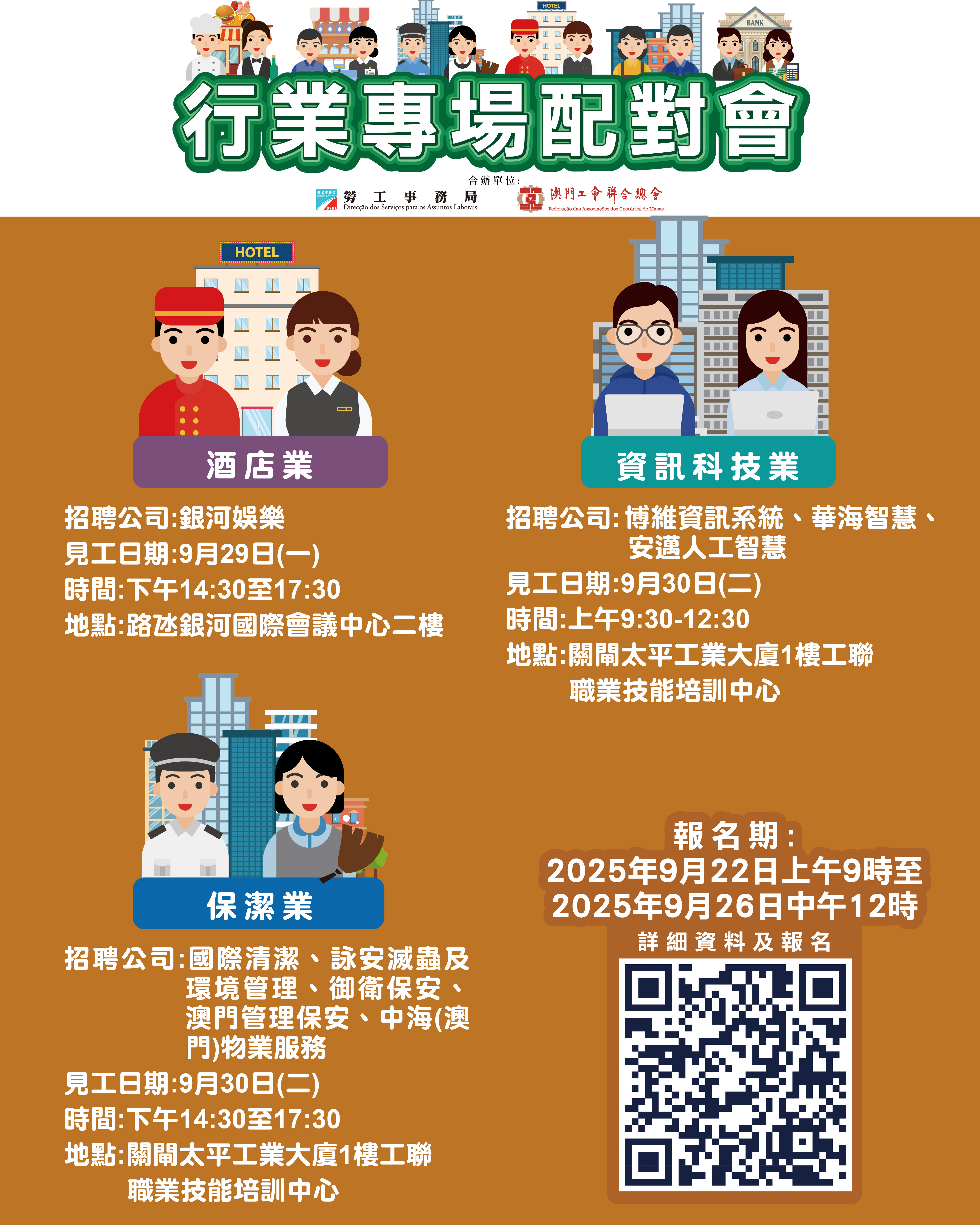 9月29日下午酒店業專場配對會在澳門銀河國際會議中心二樓舉行;9月30日上午資訊科技業專場配對會及同日下午保潔業專場配對會在澳門工聯職業技能培訓中心(關閘馬路101-105A號太平工業大廈第一期1樓)舉行。報名日期由即日起至9月26日中午12時。