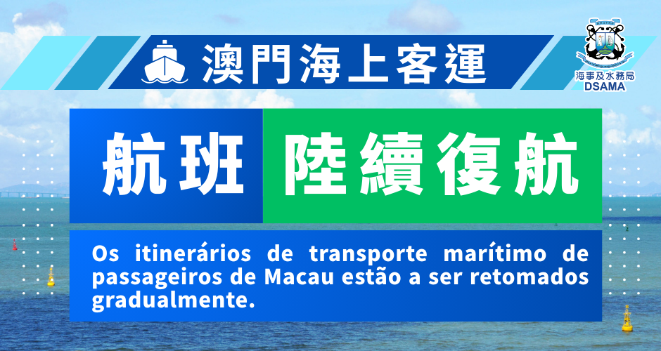 海事及水務局協調客船公司準備內地海上客運航線復航安排。澳門內港往返珠海灣仔、澳門外港和澳門氹仔往返深圳蛇口、澳門氹仔往返深圳福永、澳門氹仔往返中山的海上客運航線明早(26日)復航。