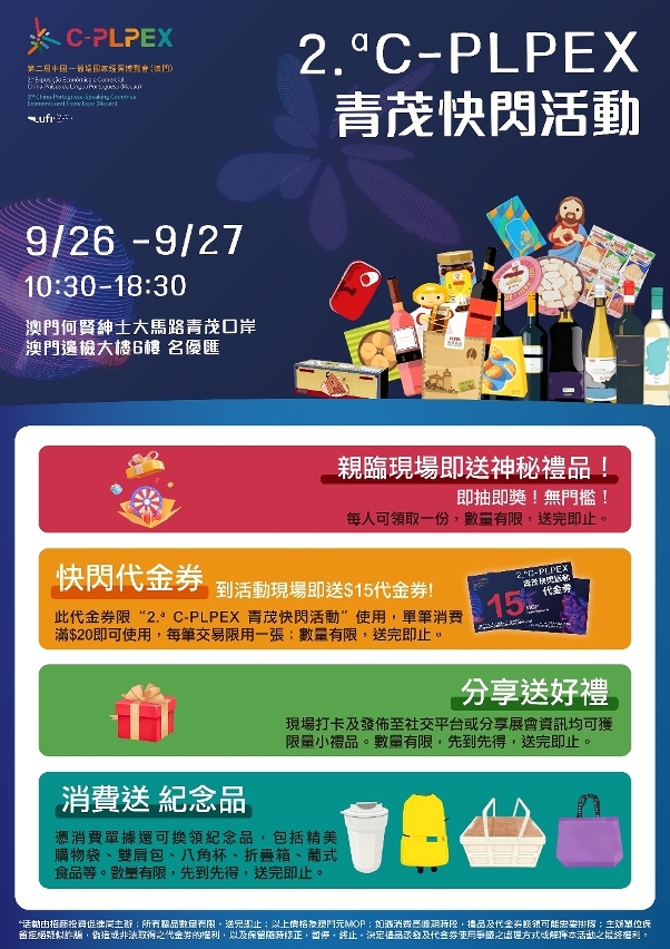 為預熱將於10月舉行的“第二屆中國—葡語國家經貿博覽會(澳門)”(2.ª C-PLPEX,下稱“第二屆中葡經貿博覽會”),澳門特區招商投資促進局今(26)日起,在青茂口岸澳門邊檢大樓6樓“名優匯” 一連兩天舉辦“2.ª C-PLPEX青茂快閃活動”,精選150款葡語國家產品進行促銷,並推出快閃代金券、消費送紀念品等多項豐富優惠,歡迎公眾踴躍參與。