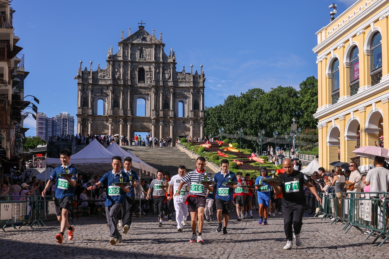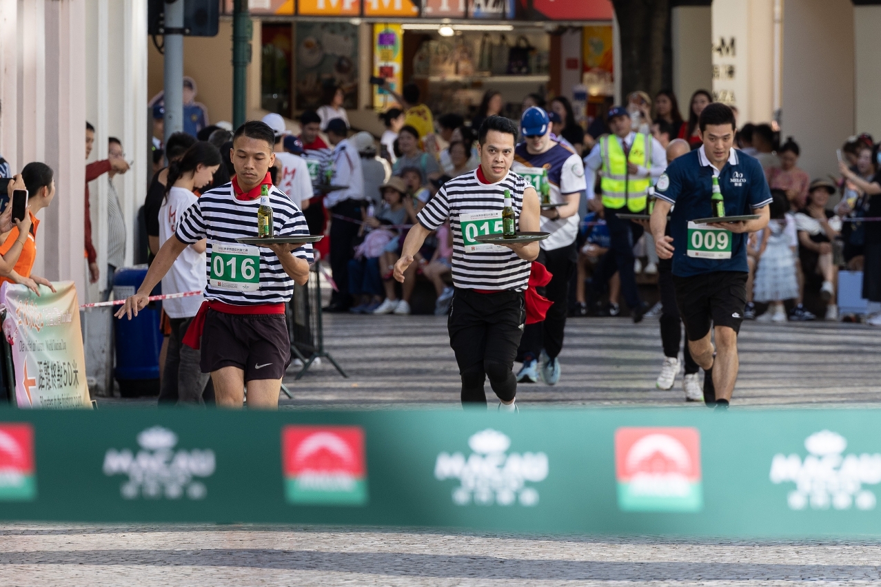 各參賽者手持載有一瓶“澳門啤酒”的托盤從大三巴牌坊出發,穿梭“澳門歷史城區”街道,務求盡快將啤酒安全送達終點議事亭前地,過程緊張刺激,沿途吸引旅客和居民駐足拍照,替參賽者打氣,展現澳門的旅遊特色與活力。