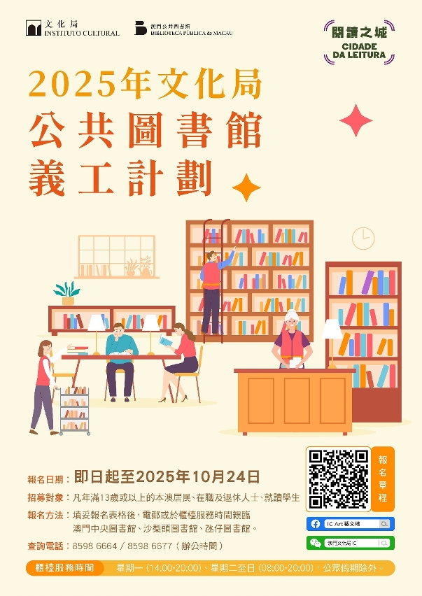 為鼓勵市民積極參與公共事務,共同營造社區閱讀氛圍,文化局現開展新一輪的 “公共圖書館義工計劃”,歡迎年滿13歲或以上及對圖書館工作感興趣的澳門居民報名。透過是次義工計劃,參加者將有機會深入體驗公共圖書館的日常運作及參與各類閱讀推廣活動,攜手推動“閱讀之城” 的建設。