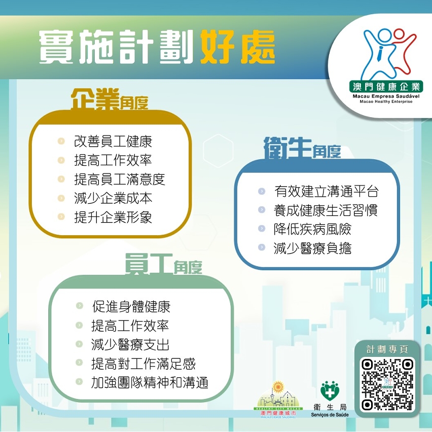 衛生局誠摯呼籲本澳企業把握機會,積極響應“健康企業”計劃,把員工健康視為企業永續發展的核心資產,共同營造支持身心健康的工作環境。
