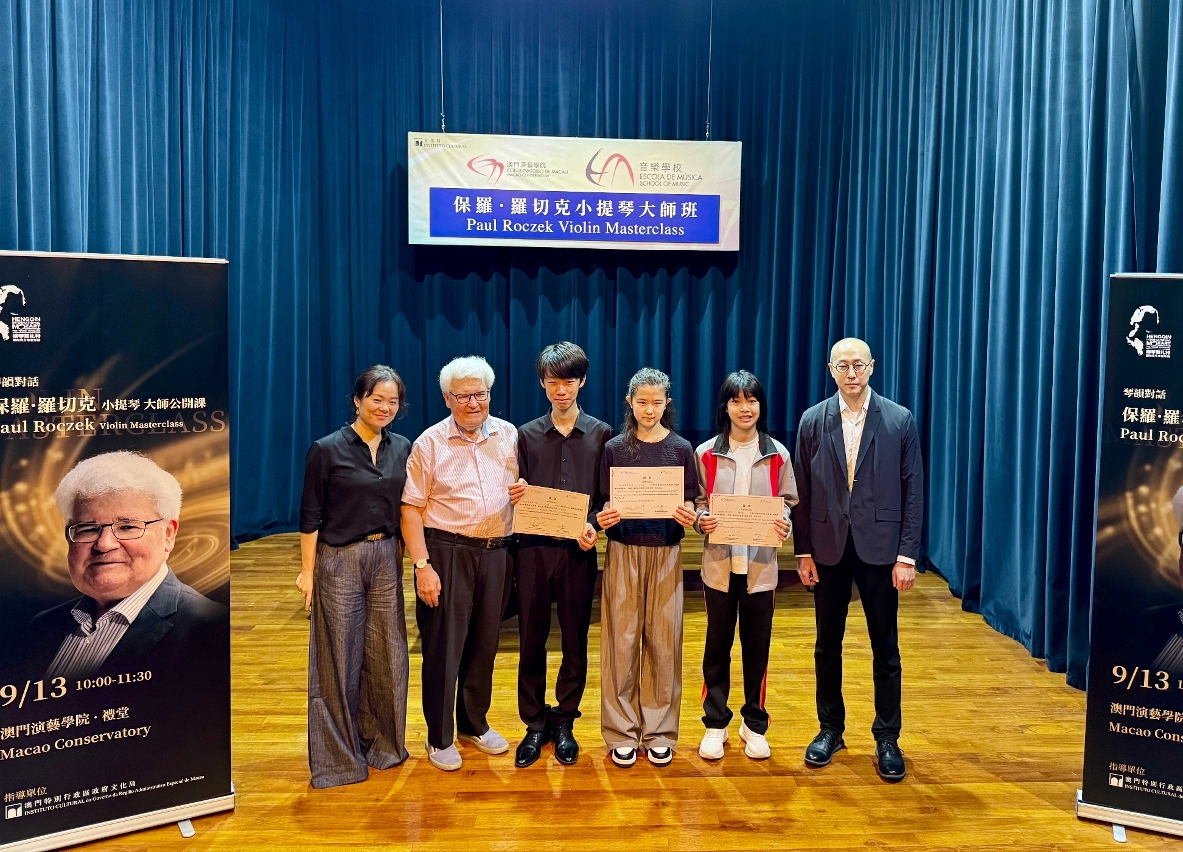 為進一步提升學生的演奏能力,文化局特邀著名小提琴家保羅・羅切克教授來澳,為多位小提琴專業學生進行指導。羅切克被譽為歐洲弦樂教育界的權威,曾擔任奧地利薩爾茨堡莫扎特音樂與表演藝術大學副校長,並於多間知名音樂院校擔任客座教授,教學足跡遍佈世界。在大師班中,由澳門演藝學院與中葡職業技術學校合辦的表演藝術班小提琴專業學生王一帆、鄭筱澄,以及音樂學校持續藝術教育課程學生王一涵,分別進行演奏,並獲羅切克指導。羅切克亦親自示範,深入講解基本功的重要性,指導學生如何協調肢體動作,並強調理解樂器的發聲原理、弓速及觸弦方式對音色產生的變化等專業知識。羅切克亦對本澳學生的演奏水平給予肯定及讚揚。