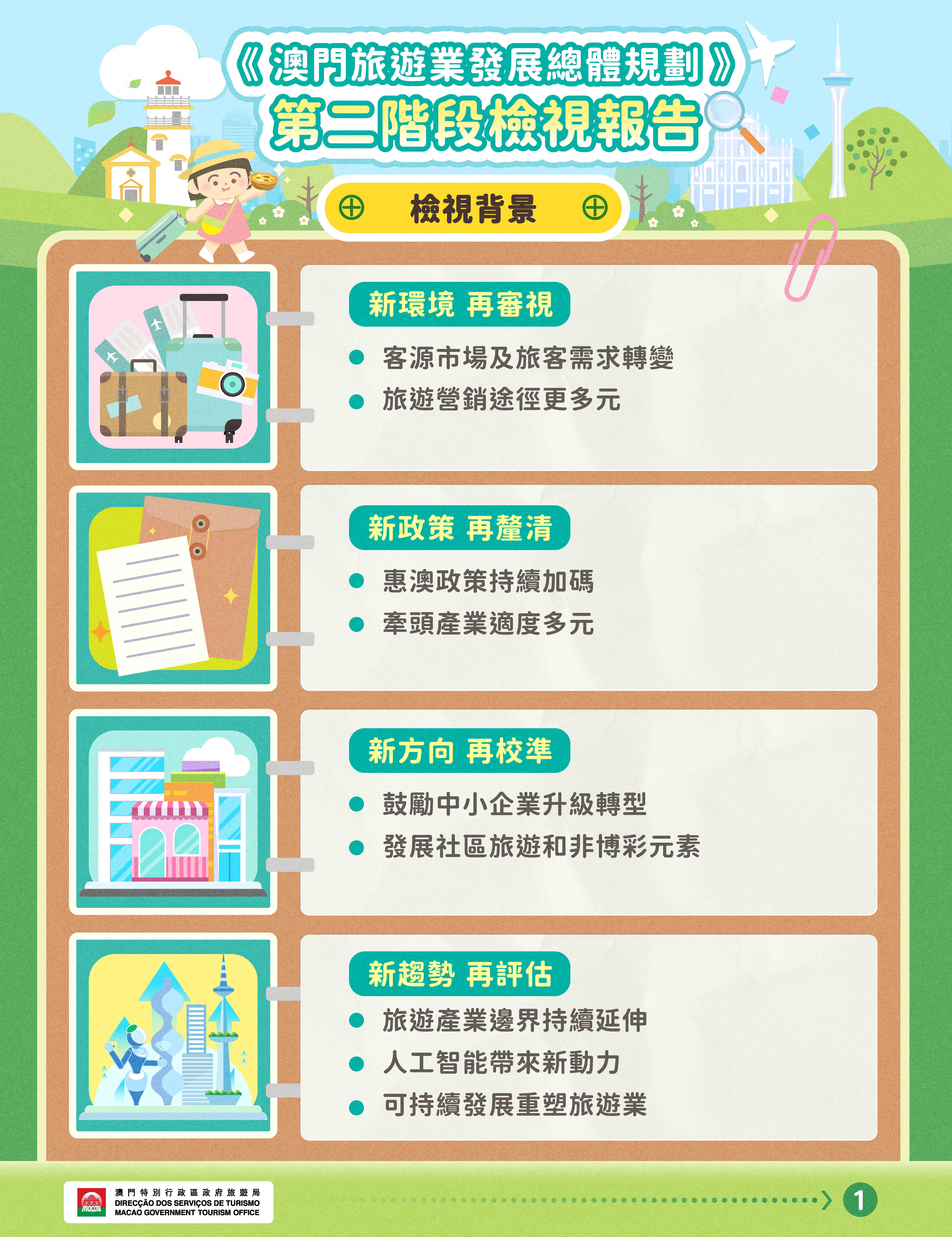 隨着全球旅遊市場加速復甦,澳門旅遊業迎來全新發展環境,加上近年國家和澳門特區相繼出台多項支持政策,面對旅遊業新趨勢,需進一步明確發展新方向與實施路徑,以推動澳門旅遊業實現高質量發展,為此,旅遊局於2024年委託研究機構進行《澳門旅遊業發展總體規劃》(以下簡稱《總體規劃》)第二階段檢視。