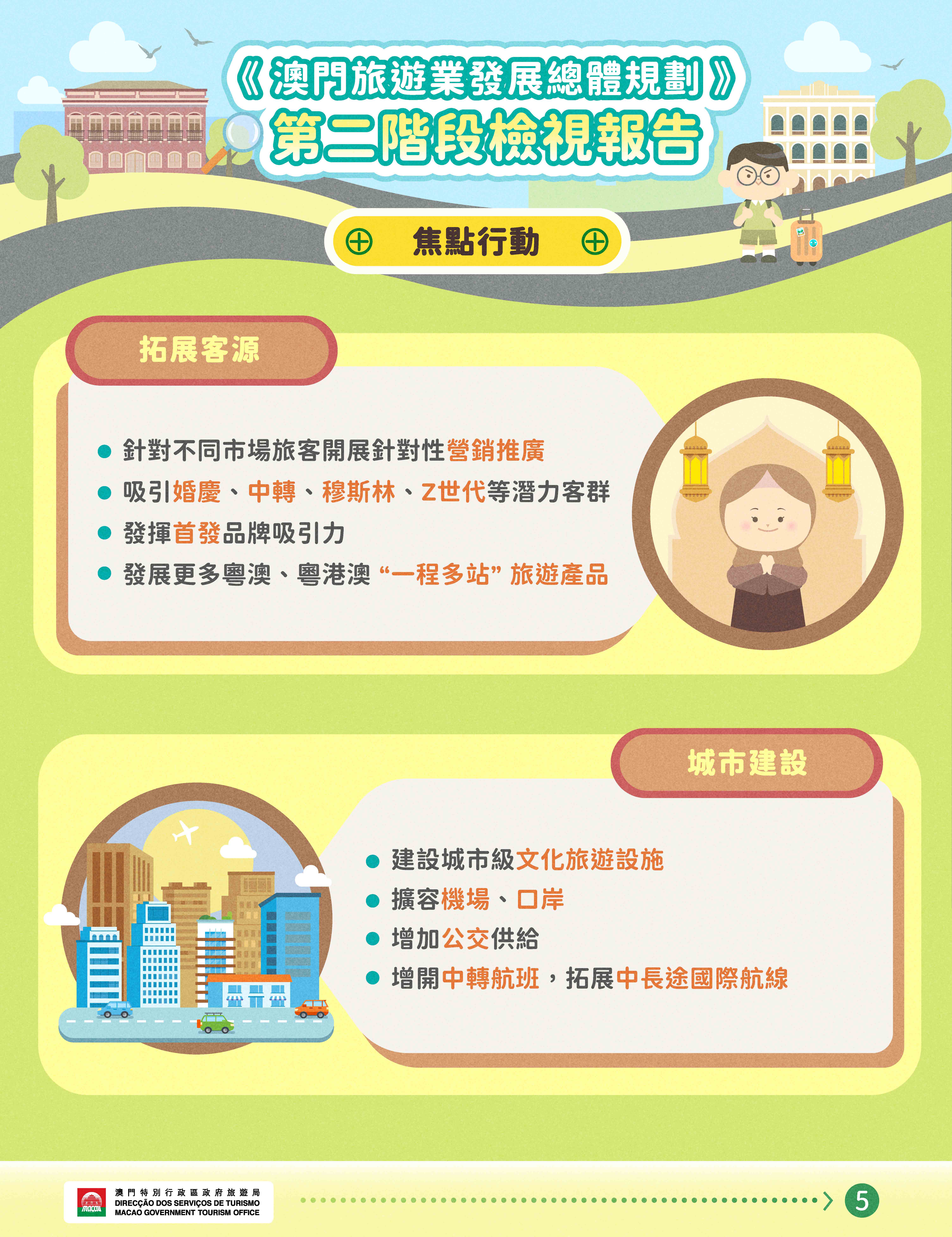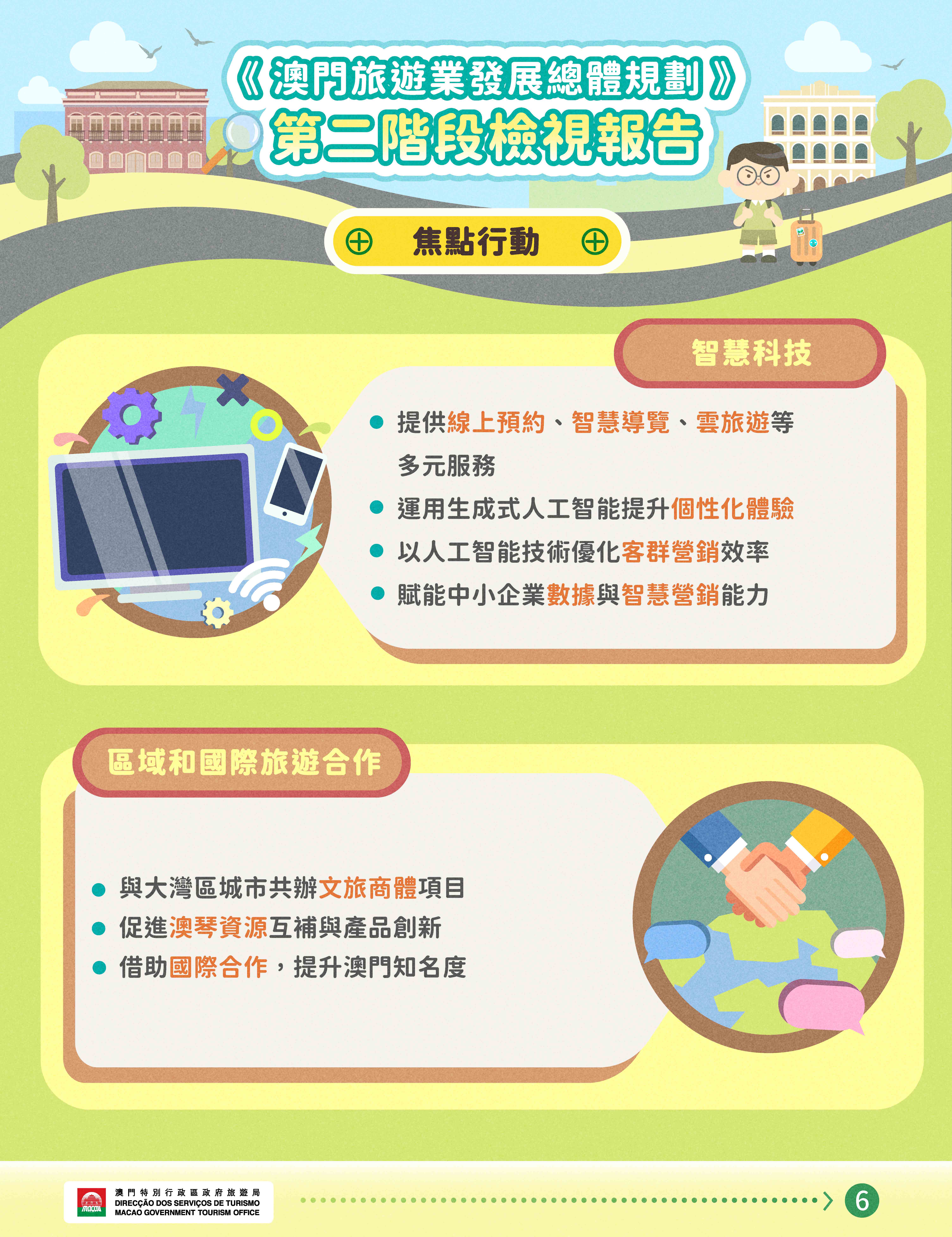 當中焦點行動包括發展多元產品組合,引入全球知名主題項目,提升本土品牌價值;提供針對特定客源市場的培訓課程,培養人工智能時代的新型人才;開展針對性的線上線下營銷推廣,發展聯程旅遊產品;拓展潛力旅遊發展空間,提升機場及口岸的接待能力;運用智慧科技提升旅客體驗,協助中小企業提升服務能力;加強與橫琴及粵港澳大灣區城市深度旅遊合作,促進國際交流等。