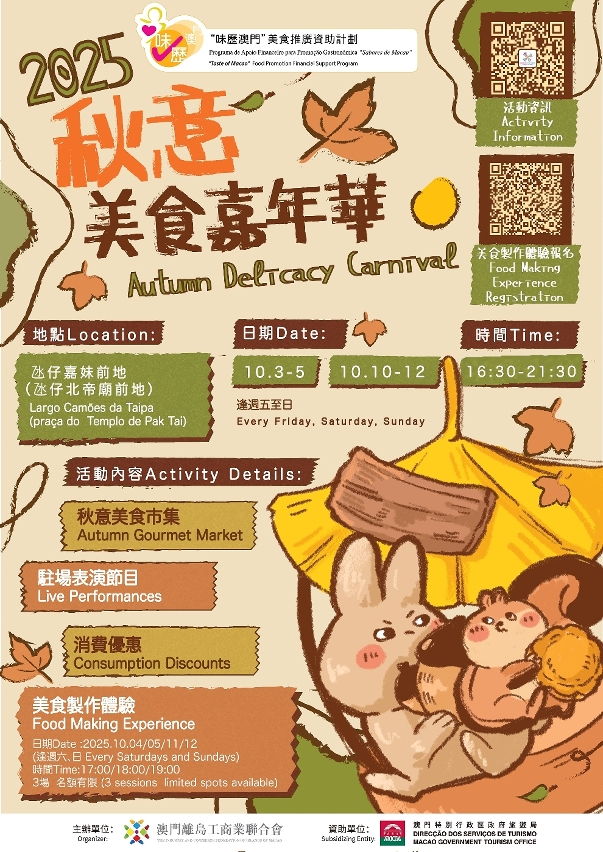 “秋意美食嘉年華”於10月3至12日的周五至周日在氹仔嘉妹前地(北帝廟前地)舉行,匯聚澳門地道美食,並安排表演及美食製作工作坊,打造美食文化派對。